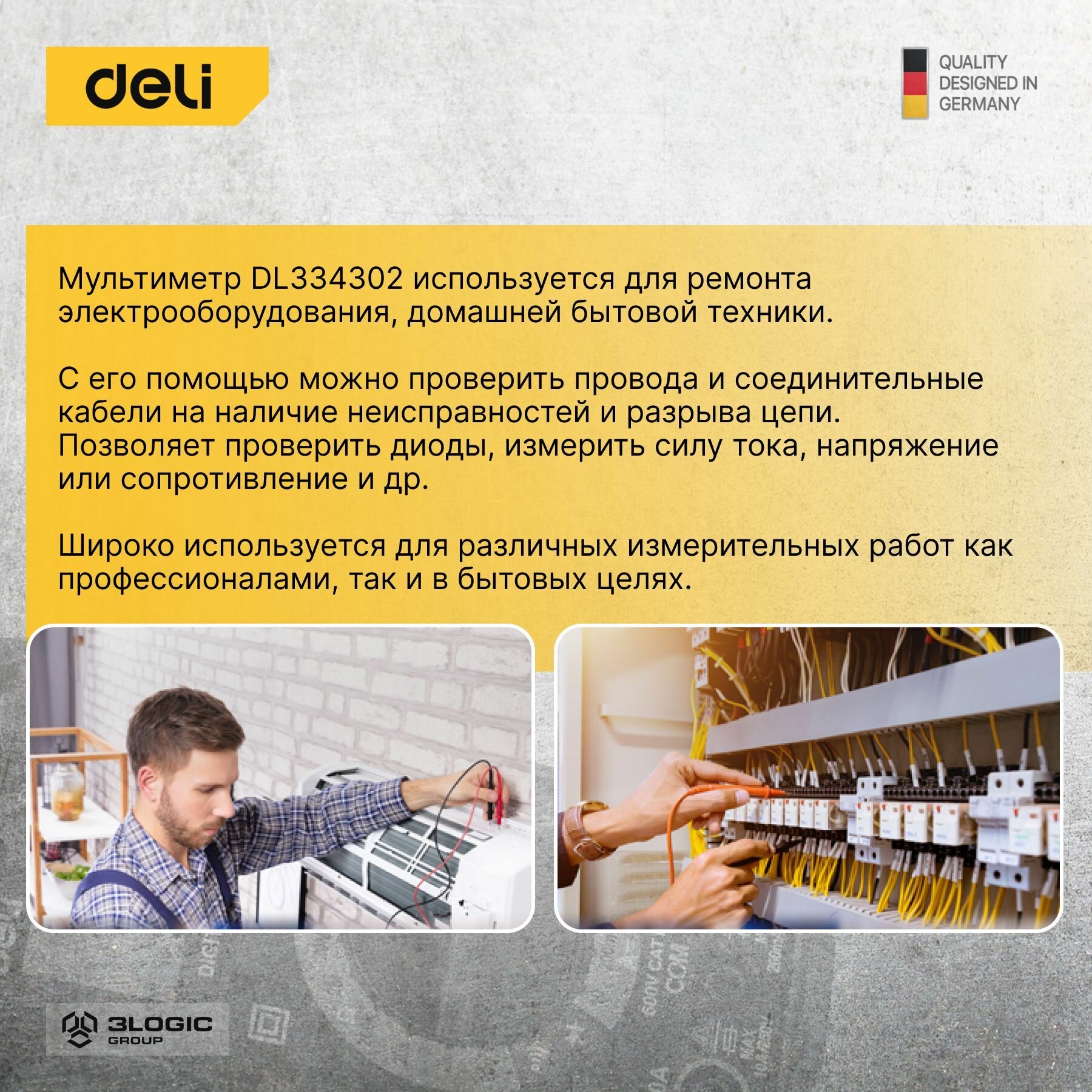 Измерительный и разметочный инструмент Deli Многофункциональный цифровой мультиметр Deli DL334302 напряж. 0,2-600В, AC/DC, ЖК-дисплей