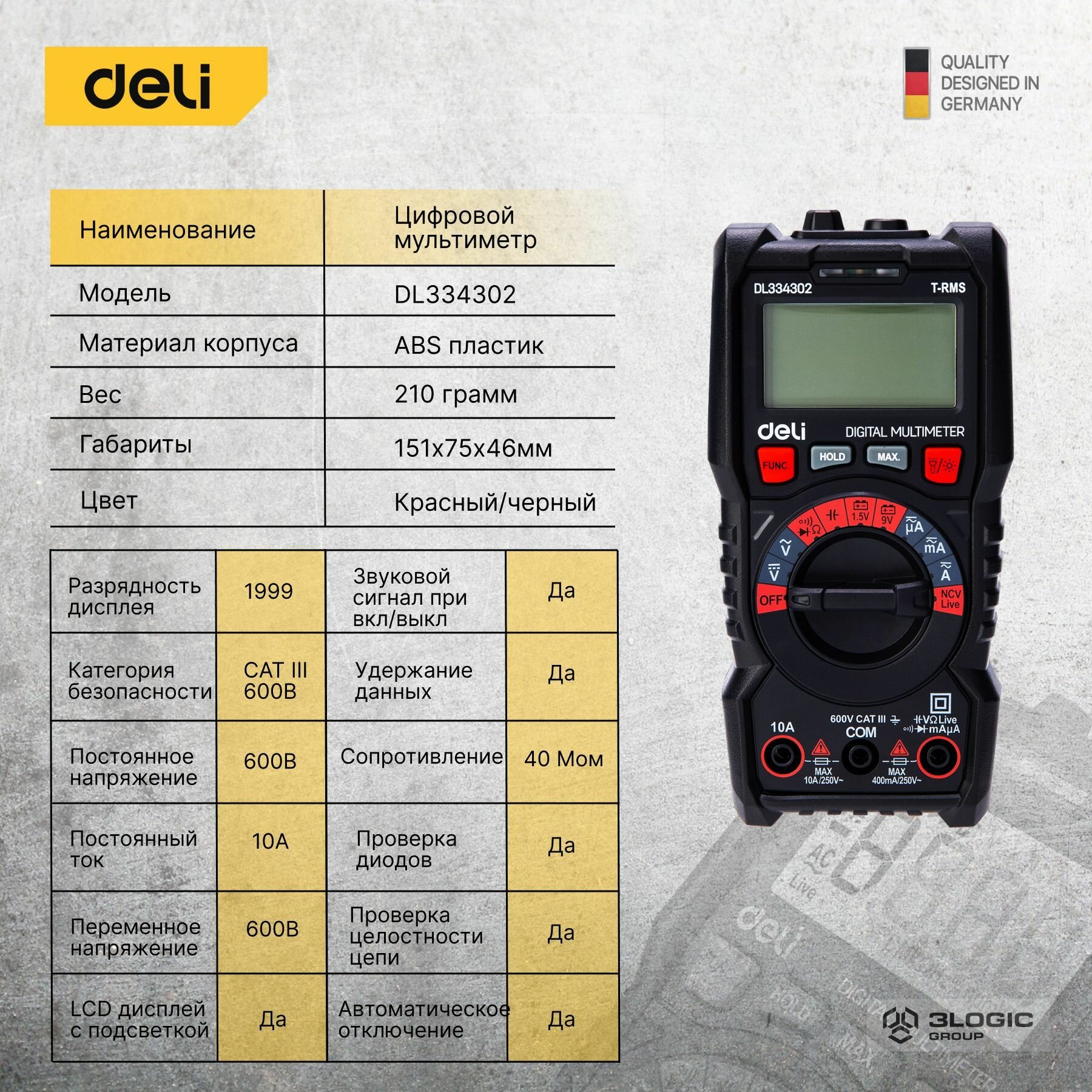 Цифровой мультиметр Deli DL334302 (напряж 0,2-600В, сила тока 0,02-10А, сопр. 0,0002-40 МОм, ЖК дисплей, 2х1, 5В ААА)