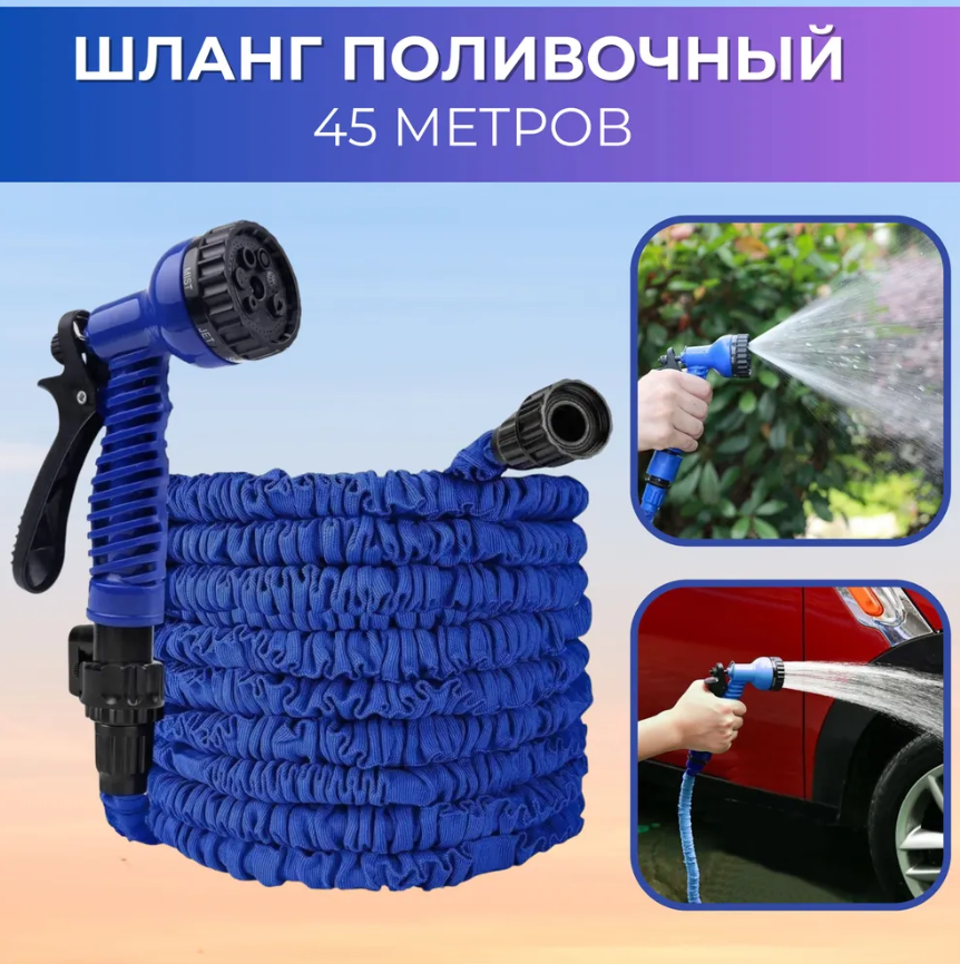 Шланг садовый, поливочный 45 м синий\растягивающийся c распылителем для полива, чудо-шланг удлиняющийся 45 м