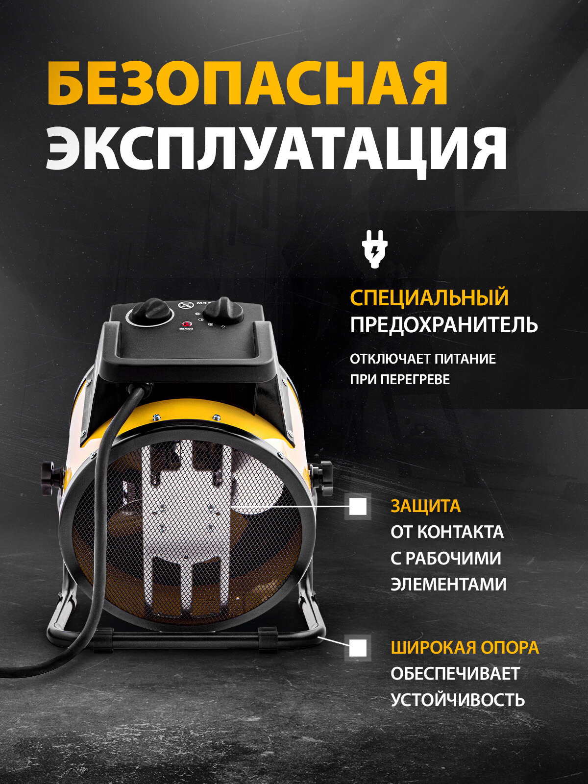 | Дополнительная информация | управление: механическое; тип нагревательного элемента: керамический нагреватель; режимы работы: вентиляция (без нагрева), теплый воздух 3 кВт, горячий воздух 5 кВт; регулировка угла наклона |