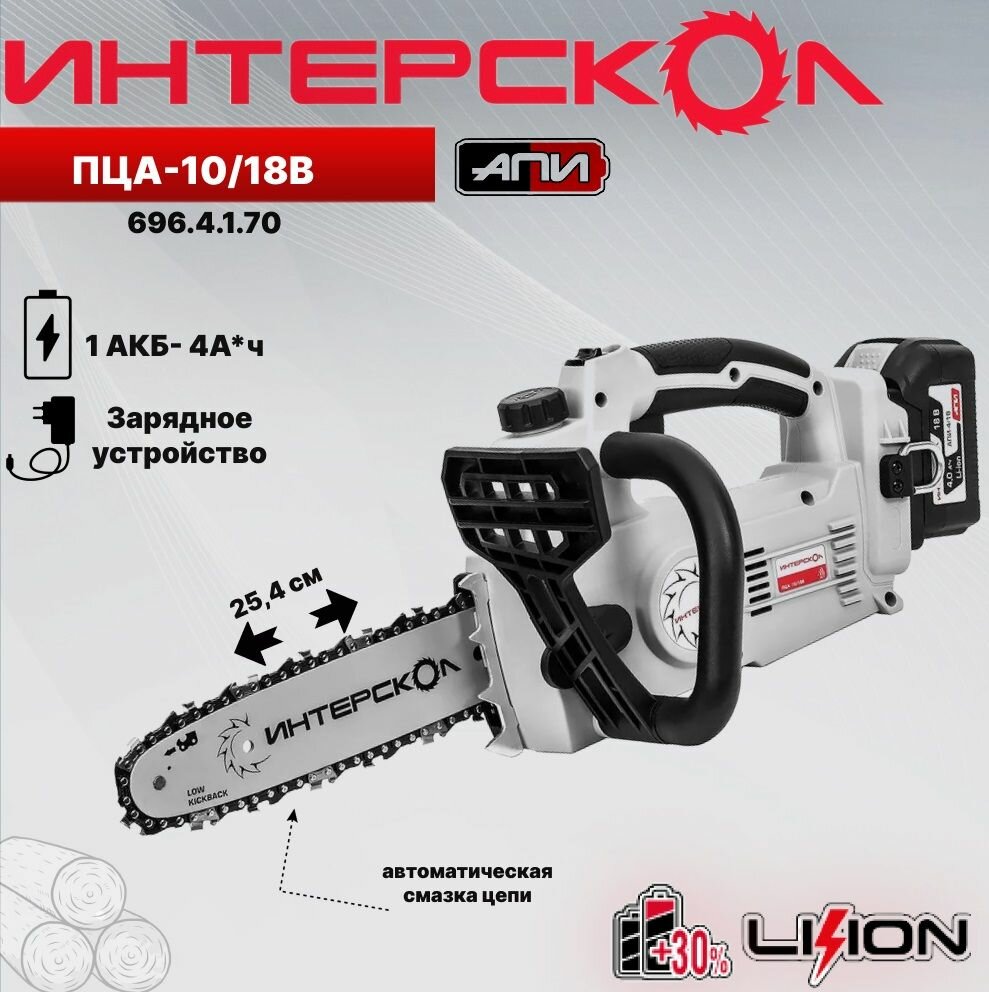 Аккумуляторная бесщеточная цепная пила ИНТЕРСКОЛ ПЦА-10/18В, 1 АКБ 4ач, з/у (696.4.1.70)