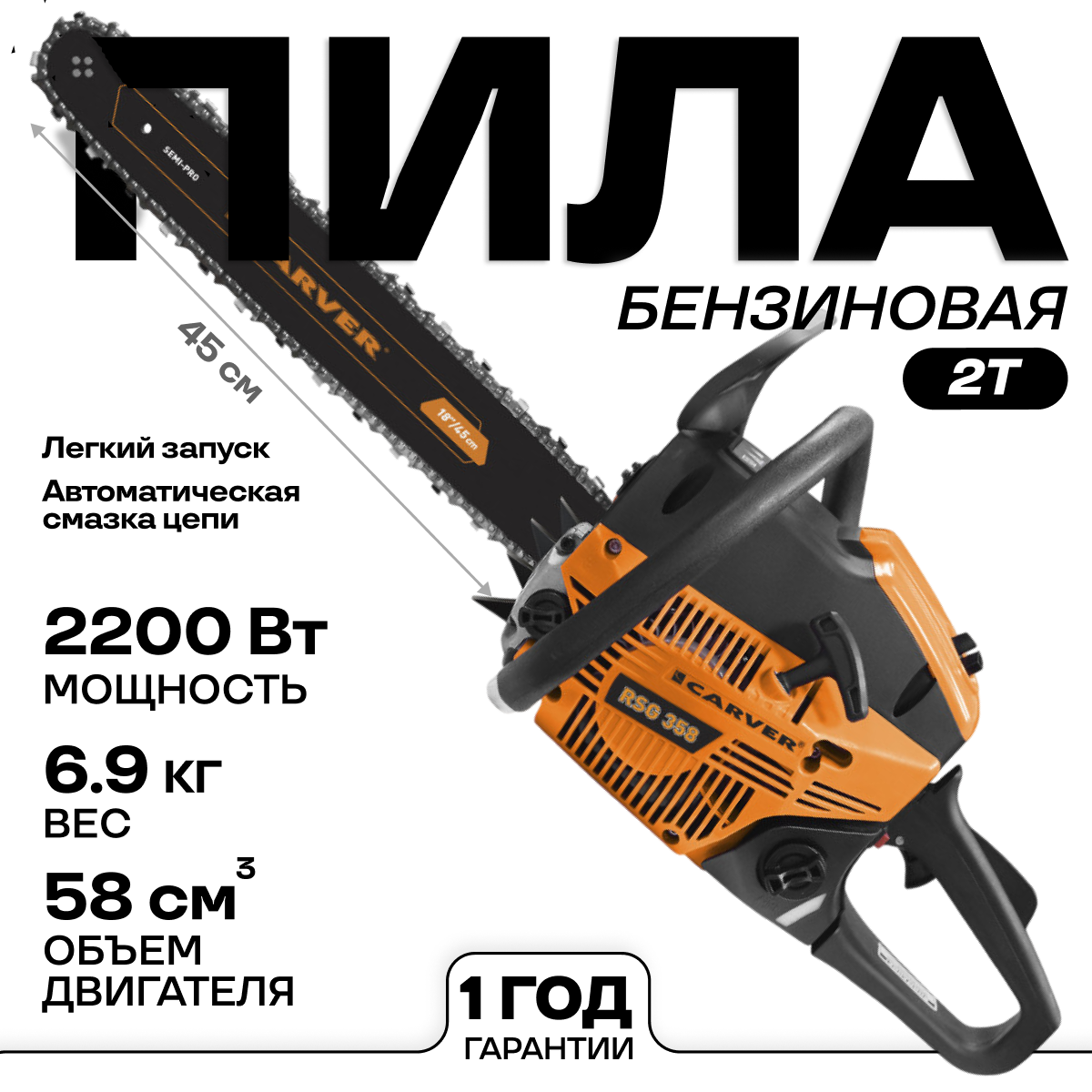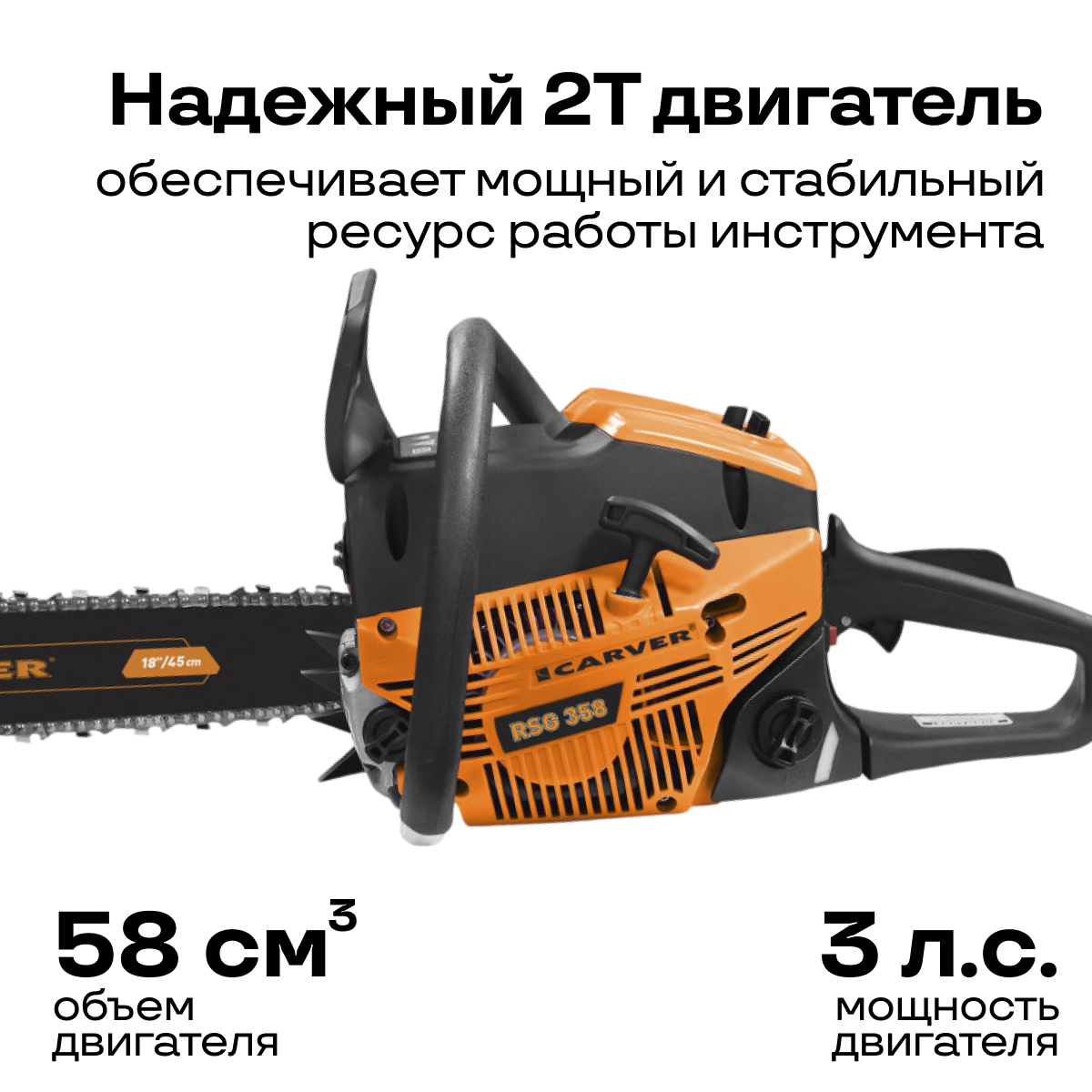 Бензопила CARVER RSG 358 (2,2 кВт, 3 л.с, 58 см.куб, шина 18"-45 см, цепь 0.325-1.5-72)
