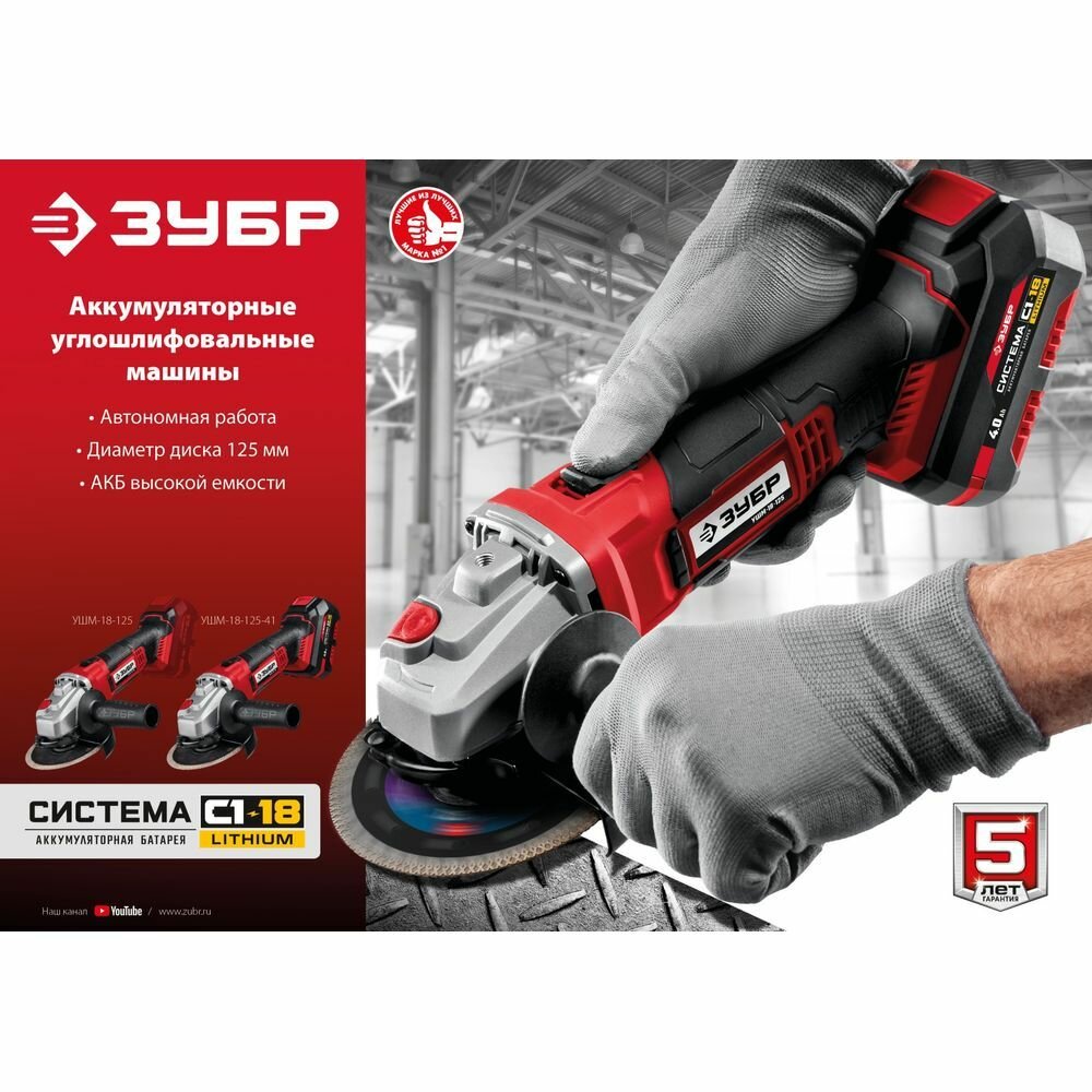 УШМ ЗУБР С1-18, 18 В, 125 мм, безАКБ, (УШМ-18-125)