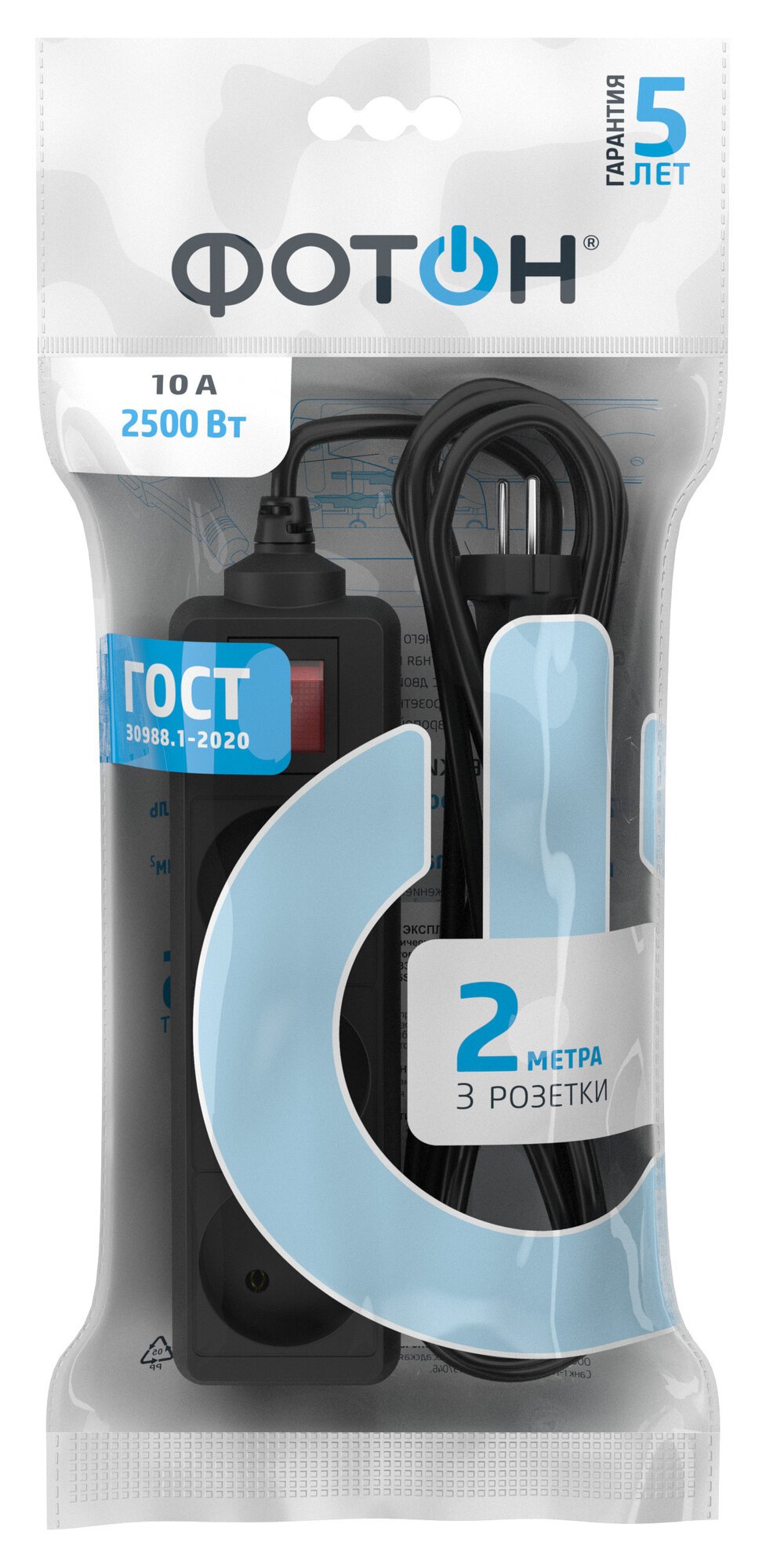 Удлинитель сетевой для розетки фотон 10А 2 метра 3 розетки с выключателем черный, ГОСТ