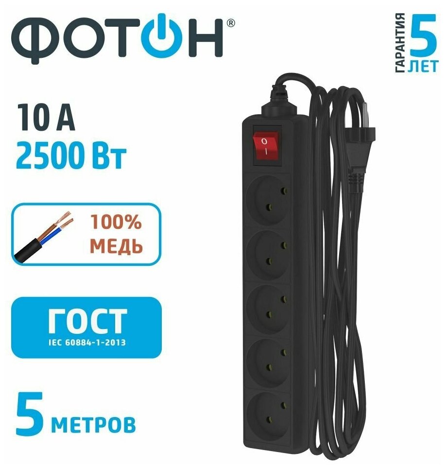 Удлинитель сетевой для розетки фотон 10А 5м 5 розеток с выключателем черный, ГОСТ