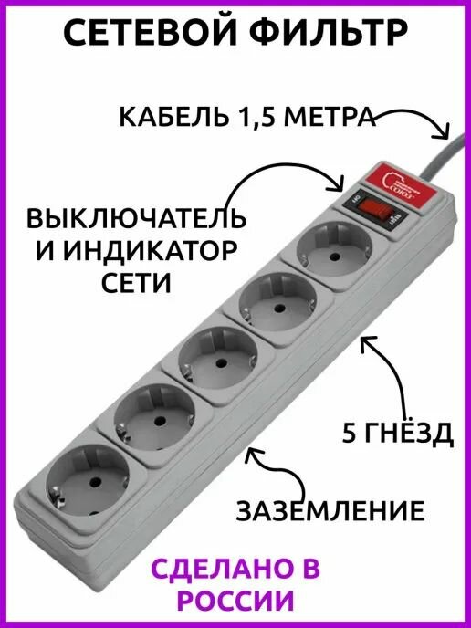Удлинители, блоки розеток, разветвители, переходники Союз Удлинитель с сетевым фильтром 5х1.5м 10А IP21 ПВС 3х0.75 сер. интересное: