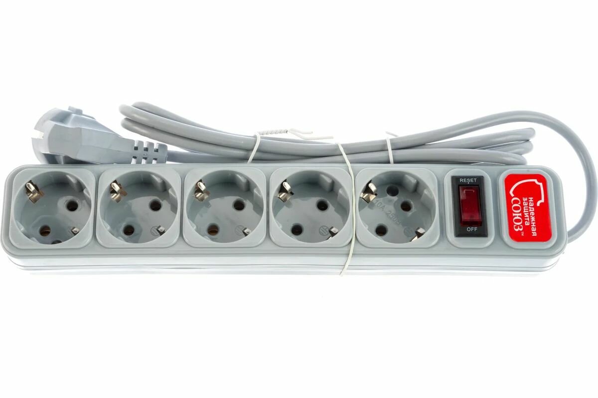 Сетевой фильтр СОЮЗ, ПВС, 3х0.75, 5гн выключатель с индикацией, с/з, серый 1.5м, 1 шт