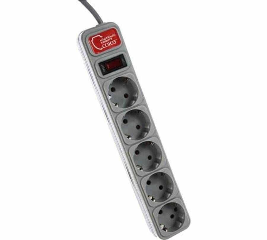 Сетевой фильтр "СОЮЗ", выключатель с индикацией, с заземлением, цвет: серый, ПВС 3 х 0,75, 5 гнезд, 1,5 м