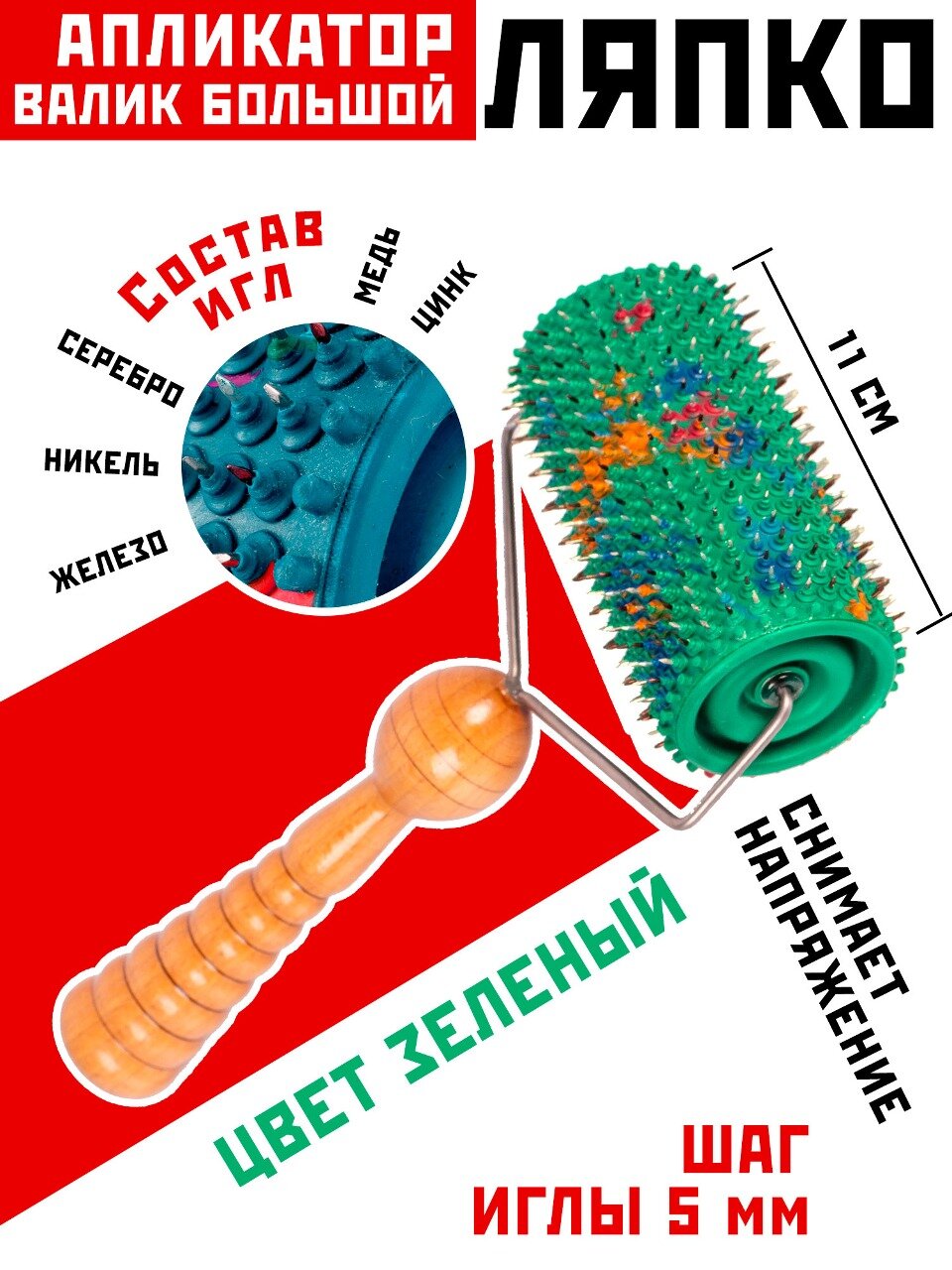Купить Массажный валик аппликатор Ляпко "Большой", (шаг 5 мм; ширина 11 см; диаметр 6,1 см; 570 игл), зеленый