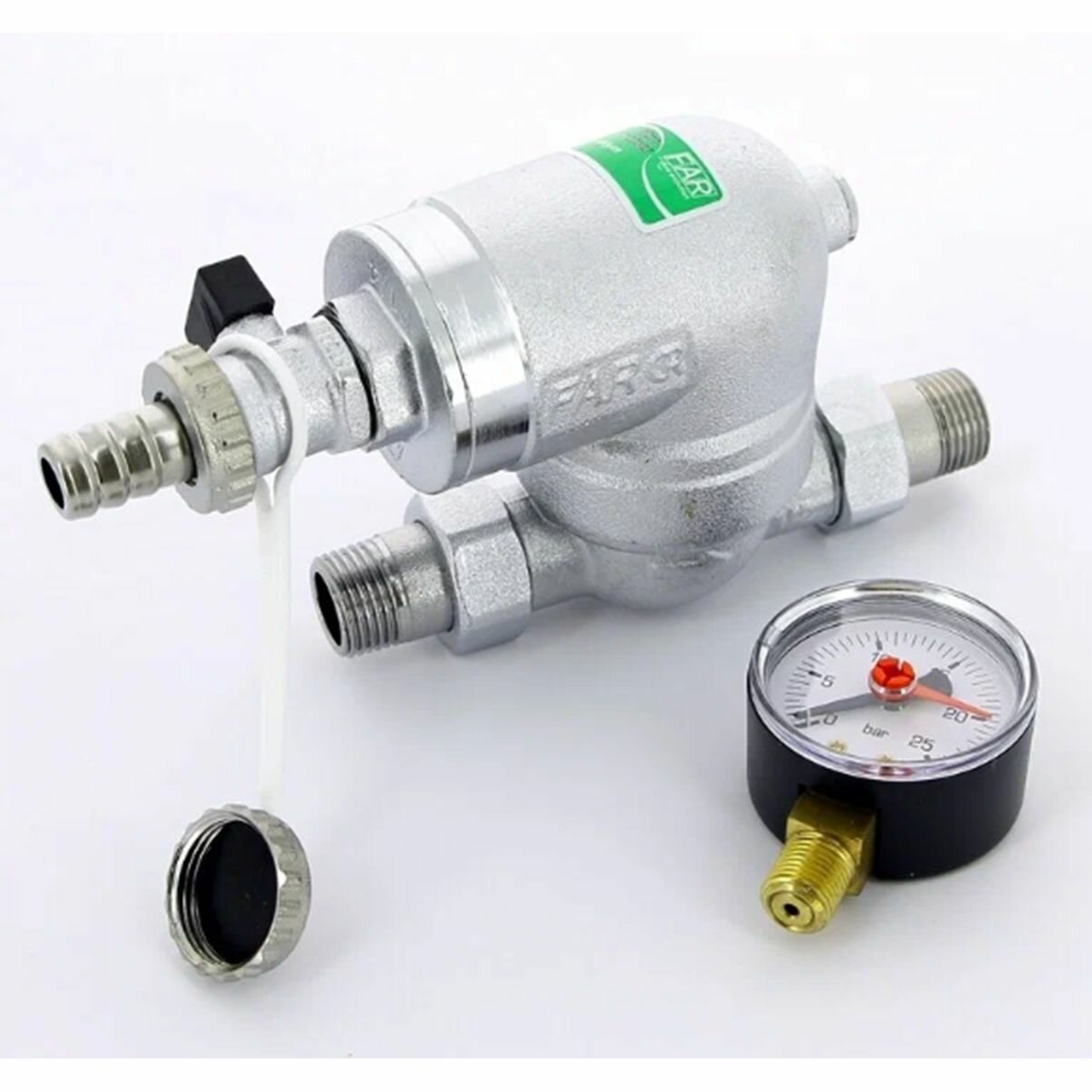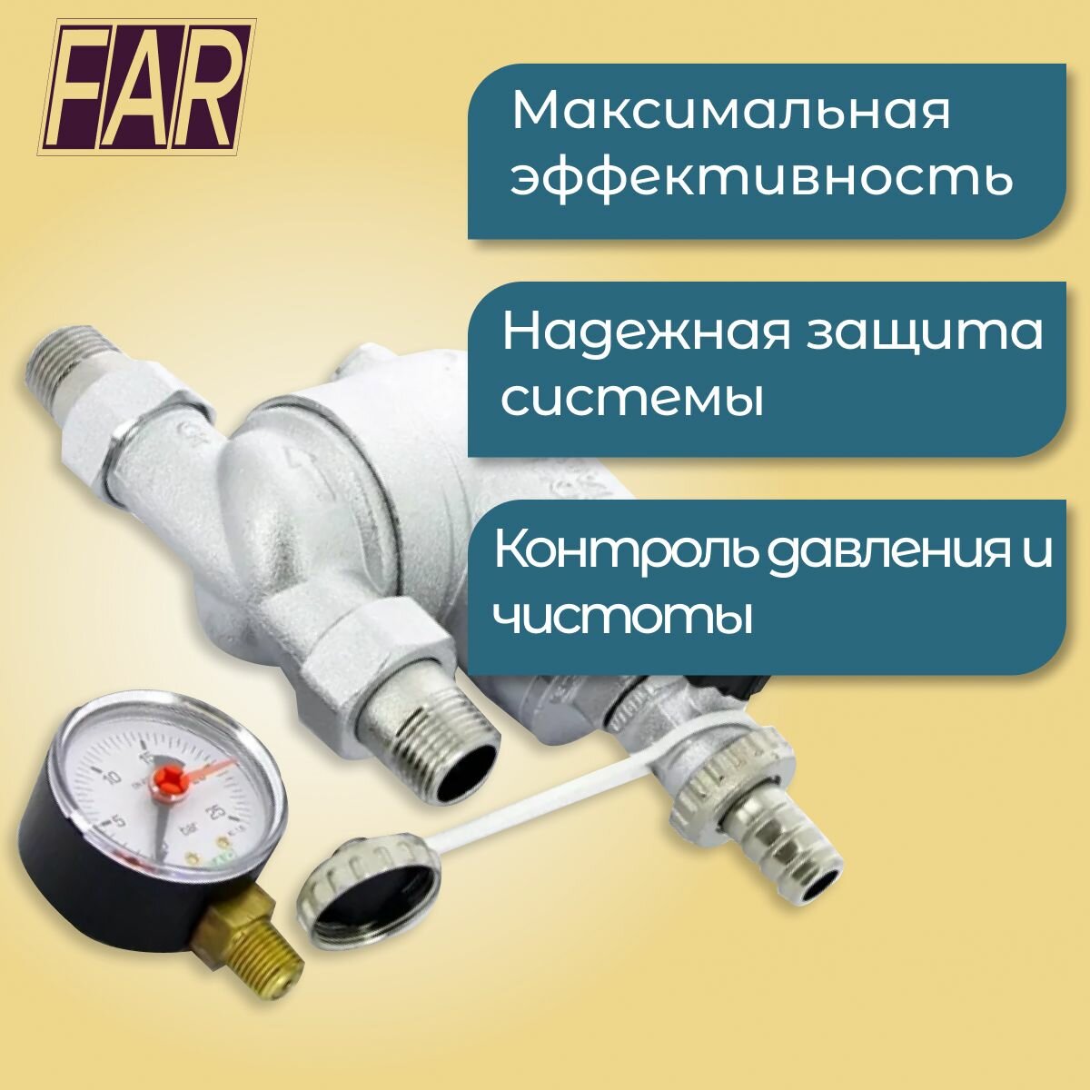 Фильтр механической очистки FAR FA 39A4 12100 муфтовый (НР/НР), латунь, со сливом, с манометром серебристый Ду 15 (1/2")