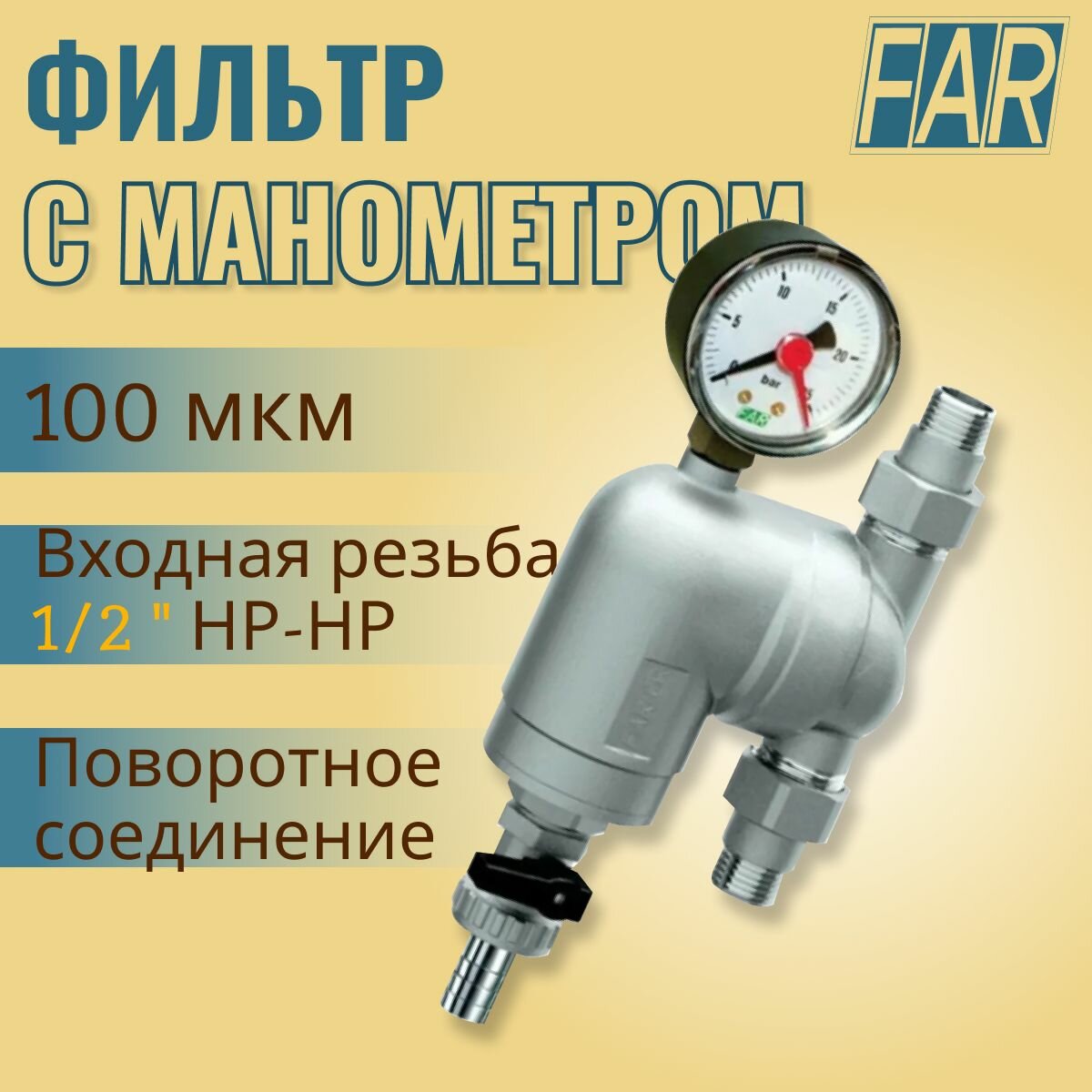 Far Фильтр 1/2" НР-НР с манометром, поворотное соединение, 100 мкм, хромированный