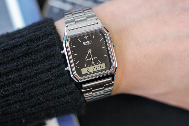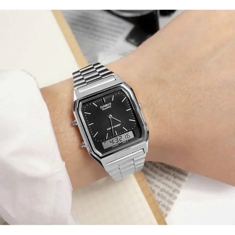 AQ-230A-7A Casio наручные часы кварцевые WR30 (3 атм) мужские, женские серебряный секундомер будильник отображение числа, второй часовой пояс, отображение дня недели, отображение месяца бесшумный механизм акриловое стекло
