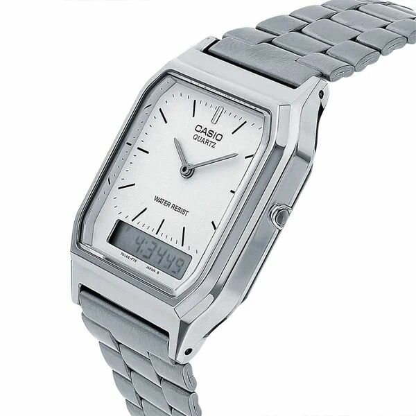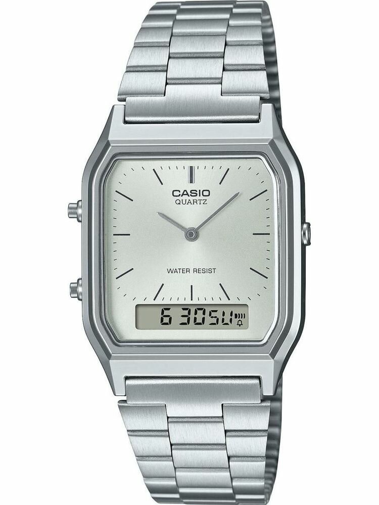 Купить AQ-230A-7A Casio наручные часы кварцевые WR30 (3 атм) мужские, женские серебряный секундомер будильник отображение числа, второй часовой пояс, отображение дня недели, отображение месяца бесшумный механизм акриловое стекло