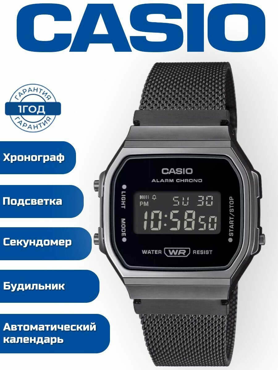 A168WEGG-1A Casio наручные часы кварцевые WR30 (3 атм) мужские, женские черный секундомер будильник отображение числа, отображение дня недели, отображение месяца подсветка дисплея акриловое стекло