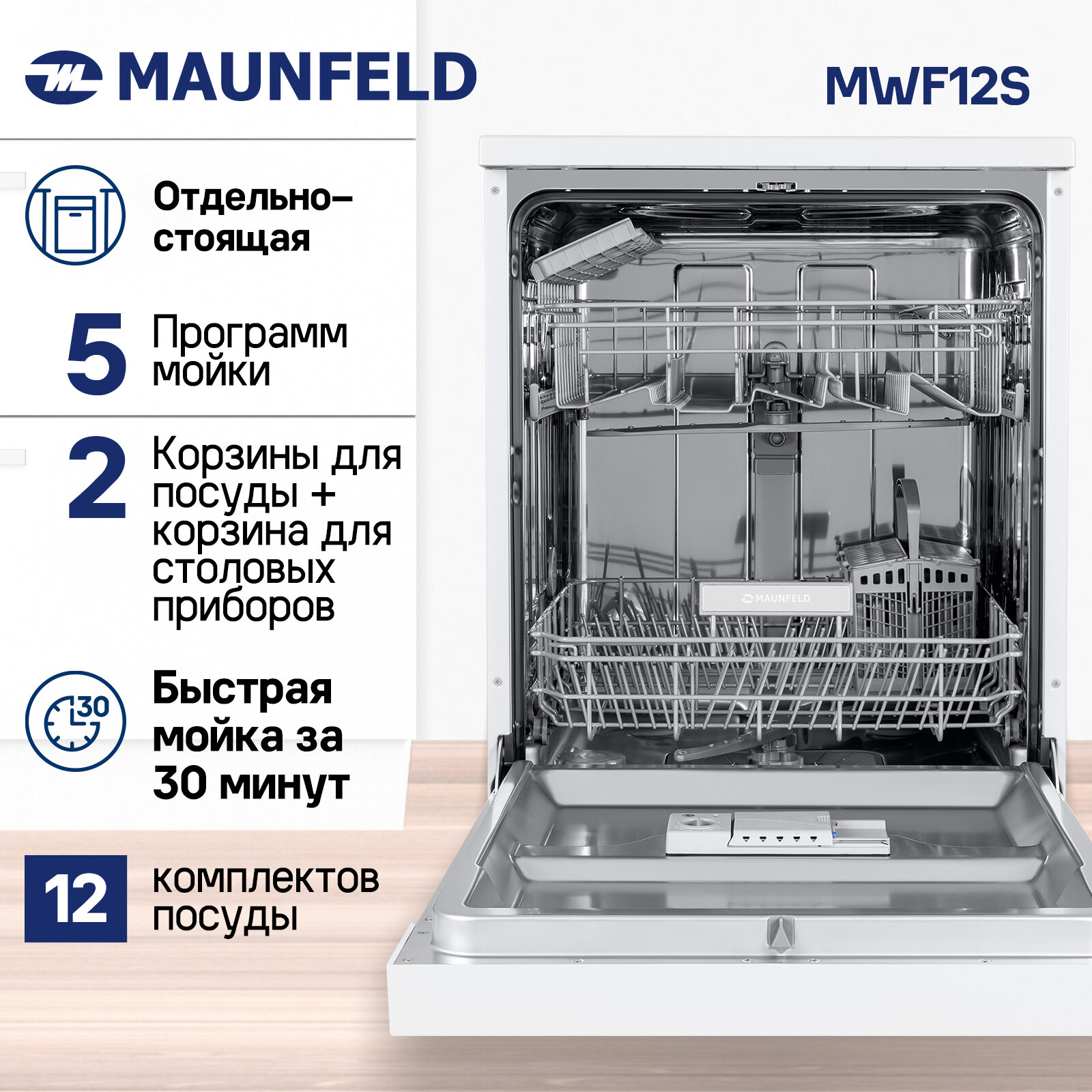 Посудомоечная машина MAUNFELD MWF12S отдельностоящая, полноразмерная 60 см, 12 комплектов, 5 программ, 2 корзины, половинная загрузка, режим быстрой мойки интересное: