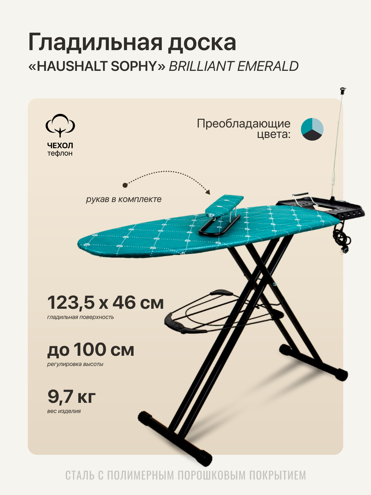 Гладильная доска Haushalt Sophy тефлон, столешница- металл, гладильный стол 123х46 см, цвет изумрудный как на фото