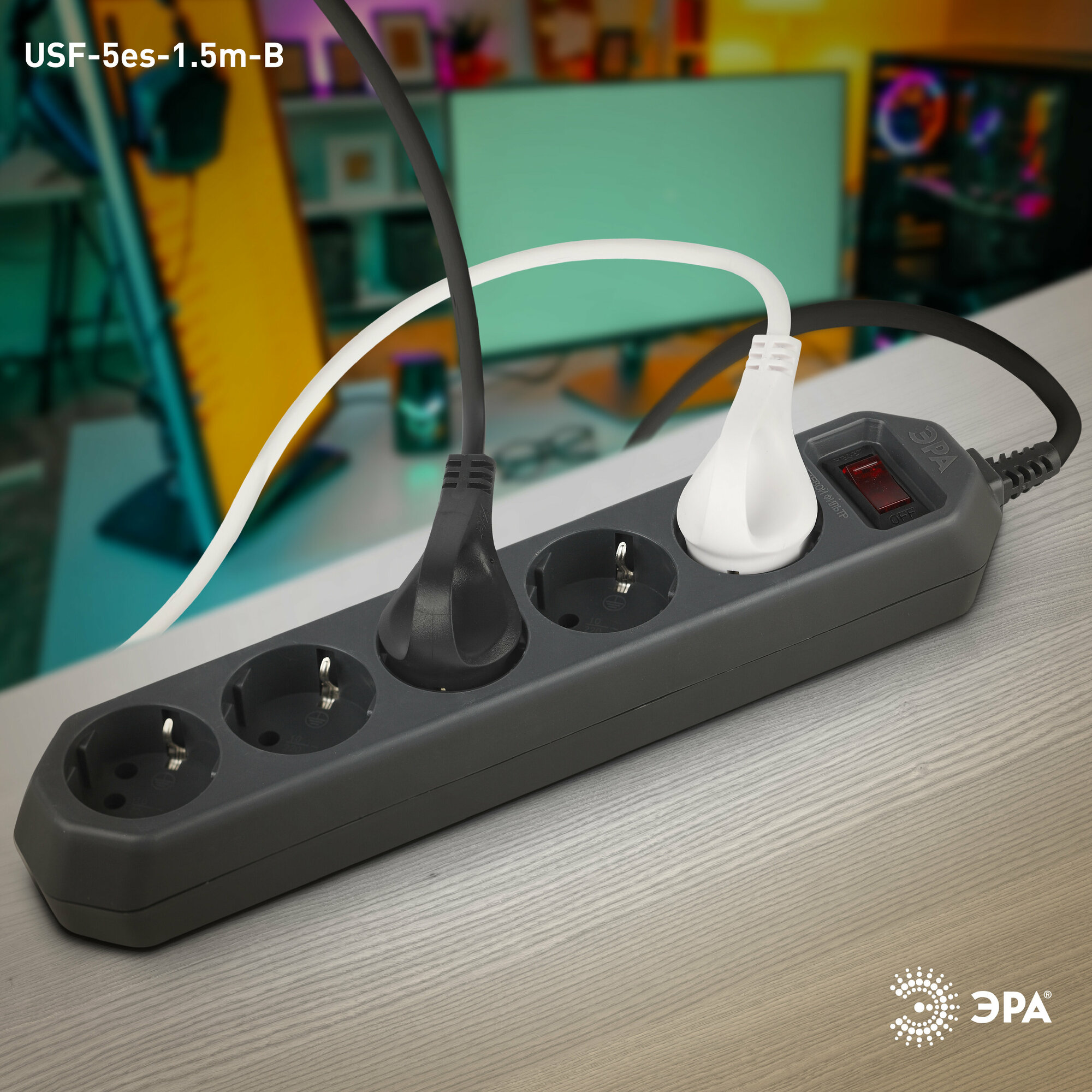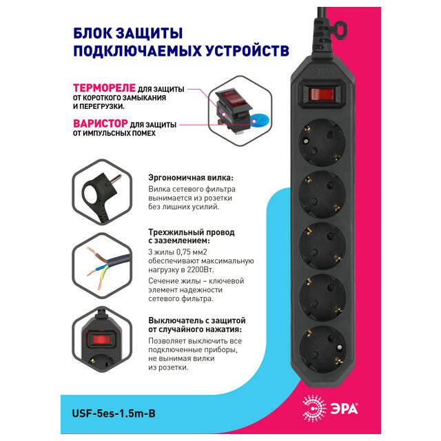 Купить Сетевой фильтр ЭРА USF-5es-1.5m-B с базовой защитой с заземл. с выкл. 5 розеток 1,5м 10А черный