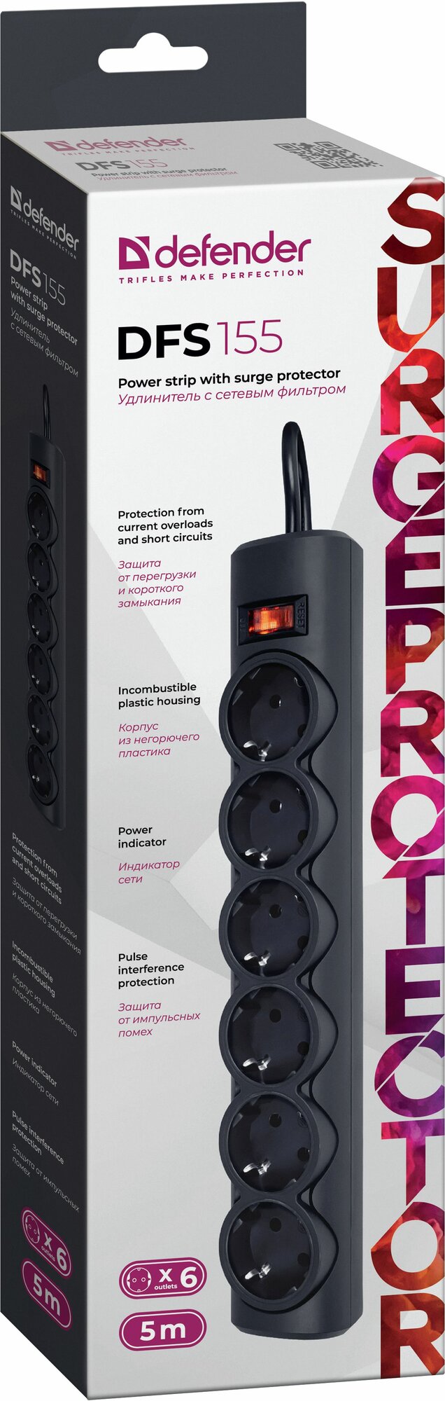 Сетевой фильтр Defender DFS 155, 6 розеток, 5.0 м, 10А / 2200 Вт, черный
