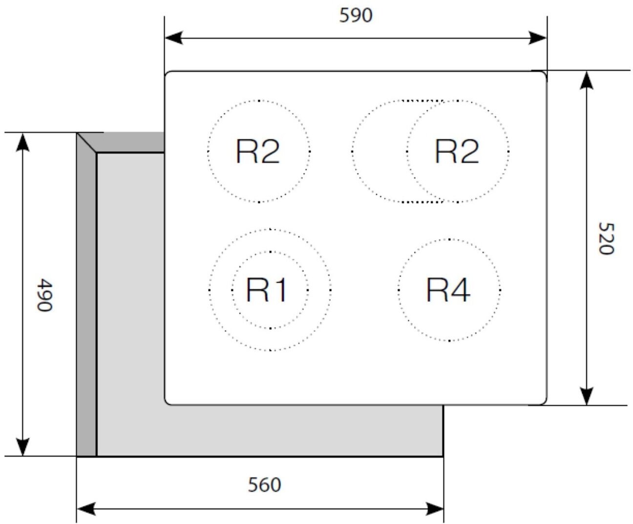 | Размеры конфорок | две конфорки диаметром 16,5 см, конфорка диаметром 14 см, с круглой зоной расширения 23 см, конфорка диаметром 16,5 см, с овальной зоной расширения 27 см |