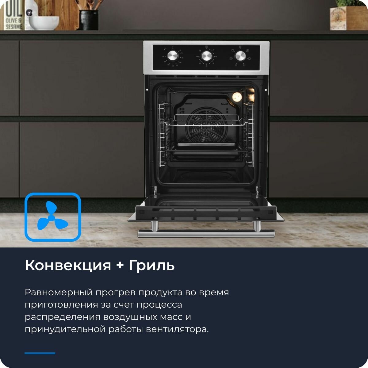 Купить Духовой шкаф электрический встраиваемый ZUGEL ZOE451X, 2200 Вт, 50 л, утапливаемые регуляторы, таймер, класс энергопотребления А, эмаль, 6 режимов работы, конвекция + гриль, серый