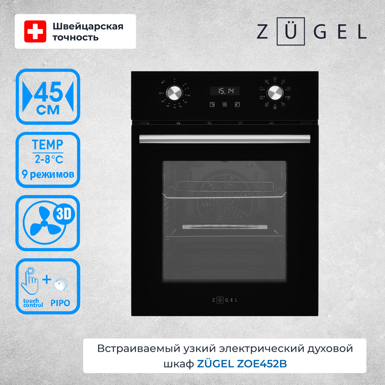 Духовой шкаф электрический встраиваемый ZUGEL ZOE452X, 2800 Вт, 50 л, утапливаемые регуляторы, дисплей, 9 режимов работы, турбо-гриль, 3D нагрев + конвекция, эмаль, серый
