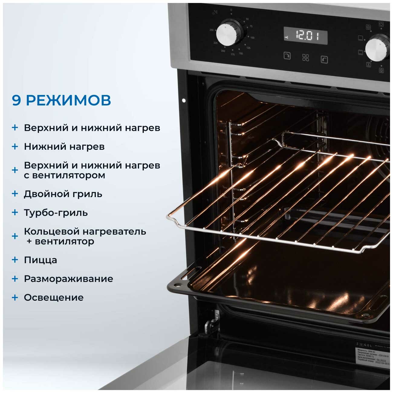 Духовой шкаф электрический встраиваемый ZUGEL ZOE452X, 2800 Вт, 50 л, утапливаемые регуляторы, дисплей, 9 режимов работы, турбо-гриль, 3D нагрев + конвекция, эмаль, серый