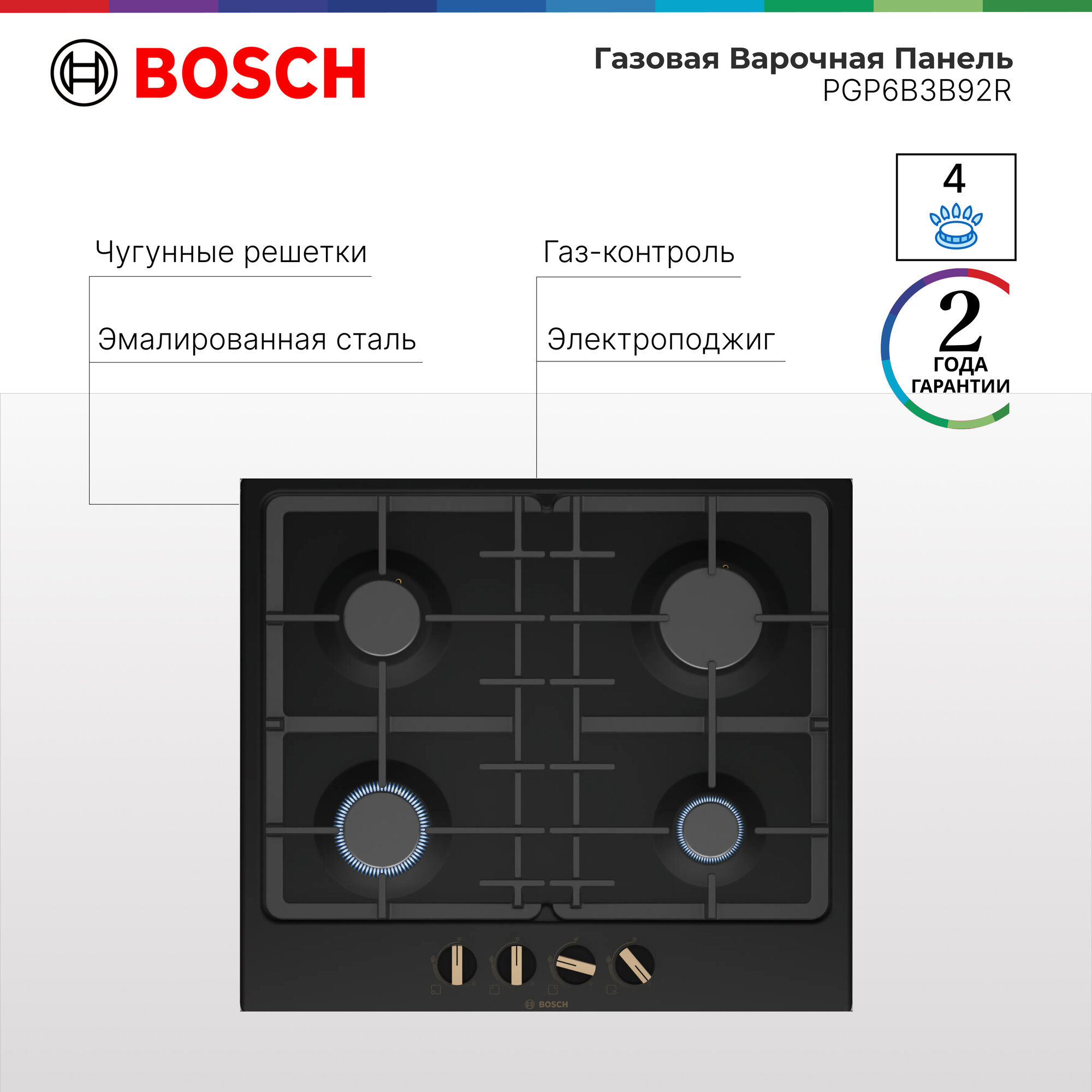Купить Газовая варочная панель Bosch PGP6B3B92R, конфорок - 4 шт, электроподжиг, газ-контроль, черный