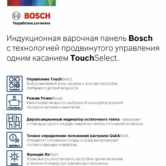 | Дополнительная информация | управление TouchSelect; функция ReStart; 17 ступеней мощности: точная регулировка уровней мощности с помощью 17 уровней (9 основных уровней и 8 промежуточных уровней); функция quickStart сама активирует конфорку, на которой установлена посуда : при включении варочная панель автоматически выбирает конфорку с посудой (в выключенном состоянии) |
