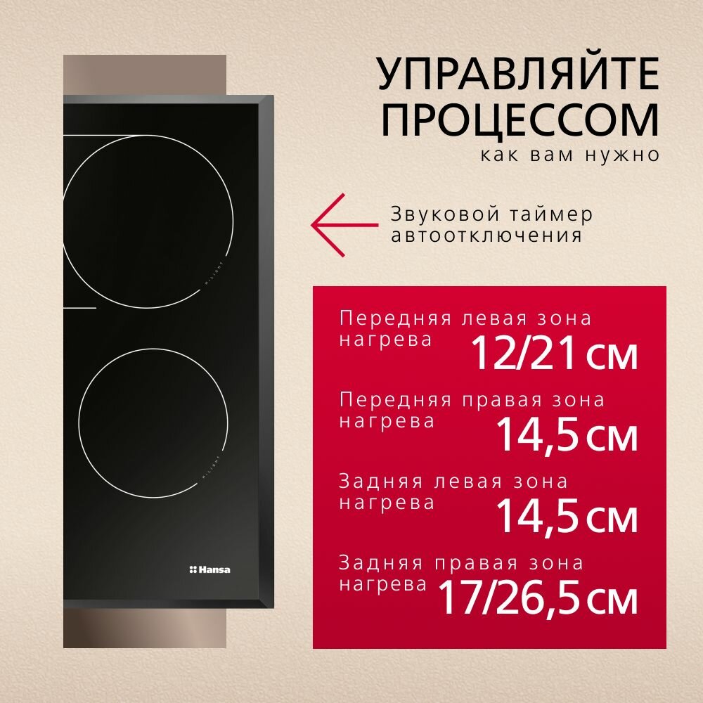 | Размеры конфорок | две конфорки диаметром 14,5 см, конфорка диаметром 16 см, с круглой зоной расширения диаметром 21 см, конфорка диаметром 17 см, с овальной зоной расширения 26,5 см |