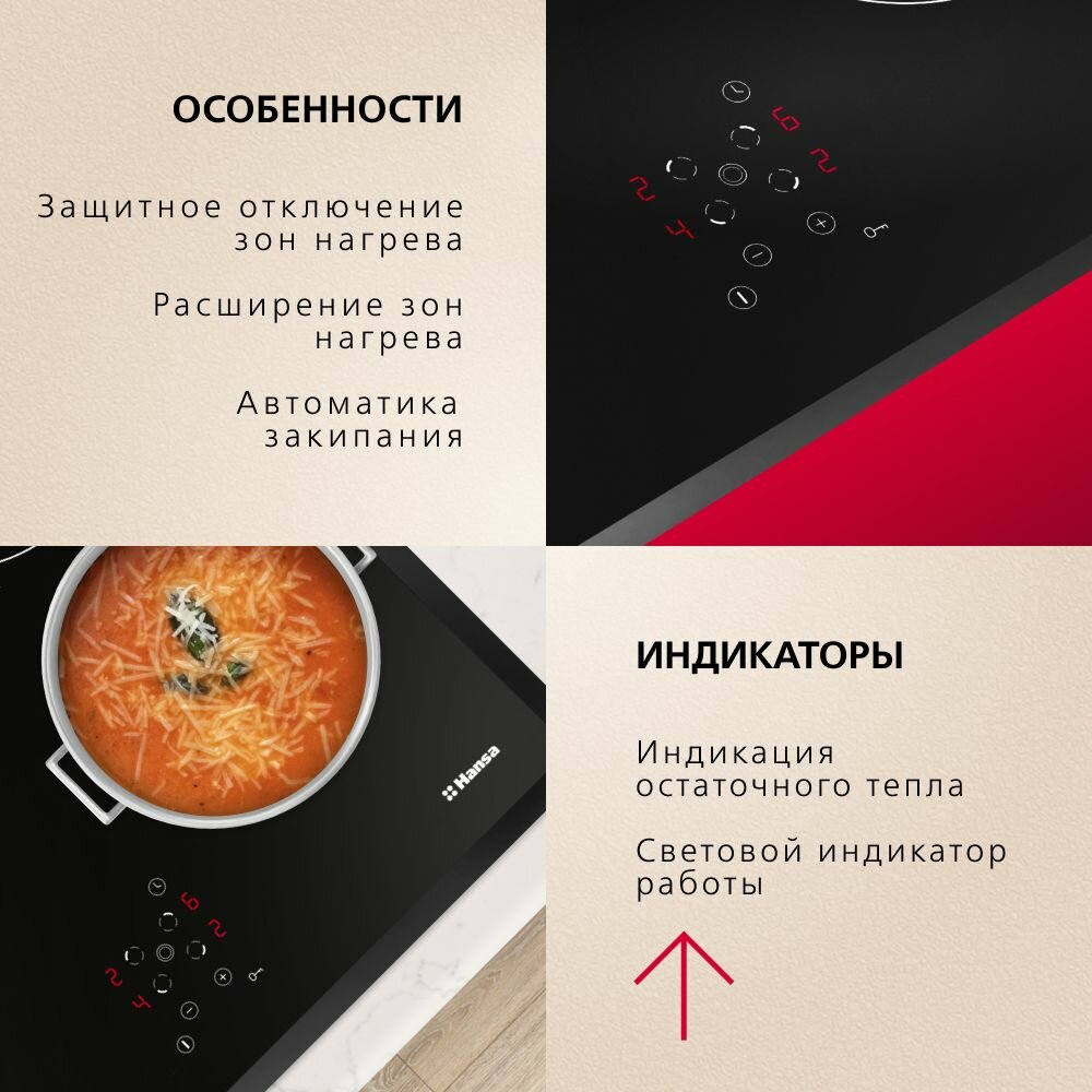 Электрическая варочная панель Hansa BHC66706, стеклокерамическая поверхность, блокировка от детей, таймер, автоматика закипания, автоотключение, индикация остаточного тепла, черная