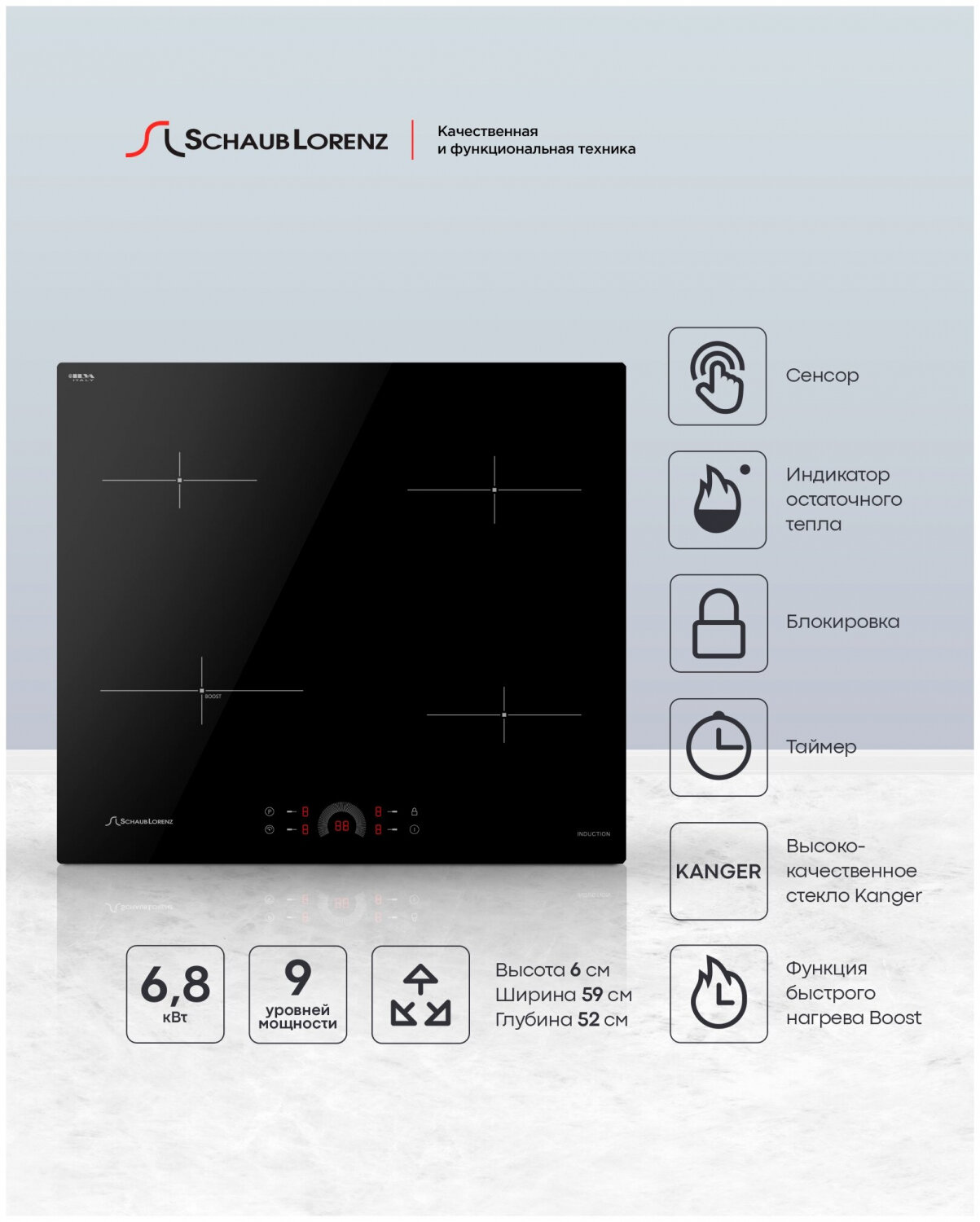 Индукционная стеклокерамическая варочная панель Schaub Lorenz SLK IY 61 H1, встраиваемая, быстрый нагрев, сенсорное управление, автоматическое отключение, индикатор остаточного тепла