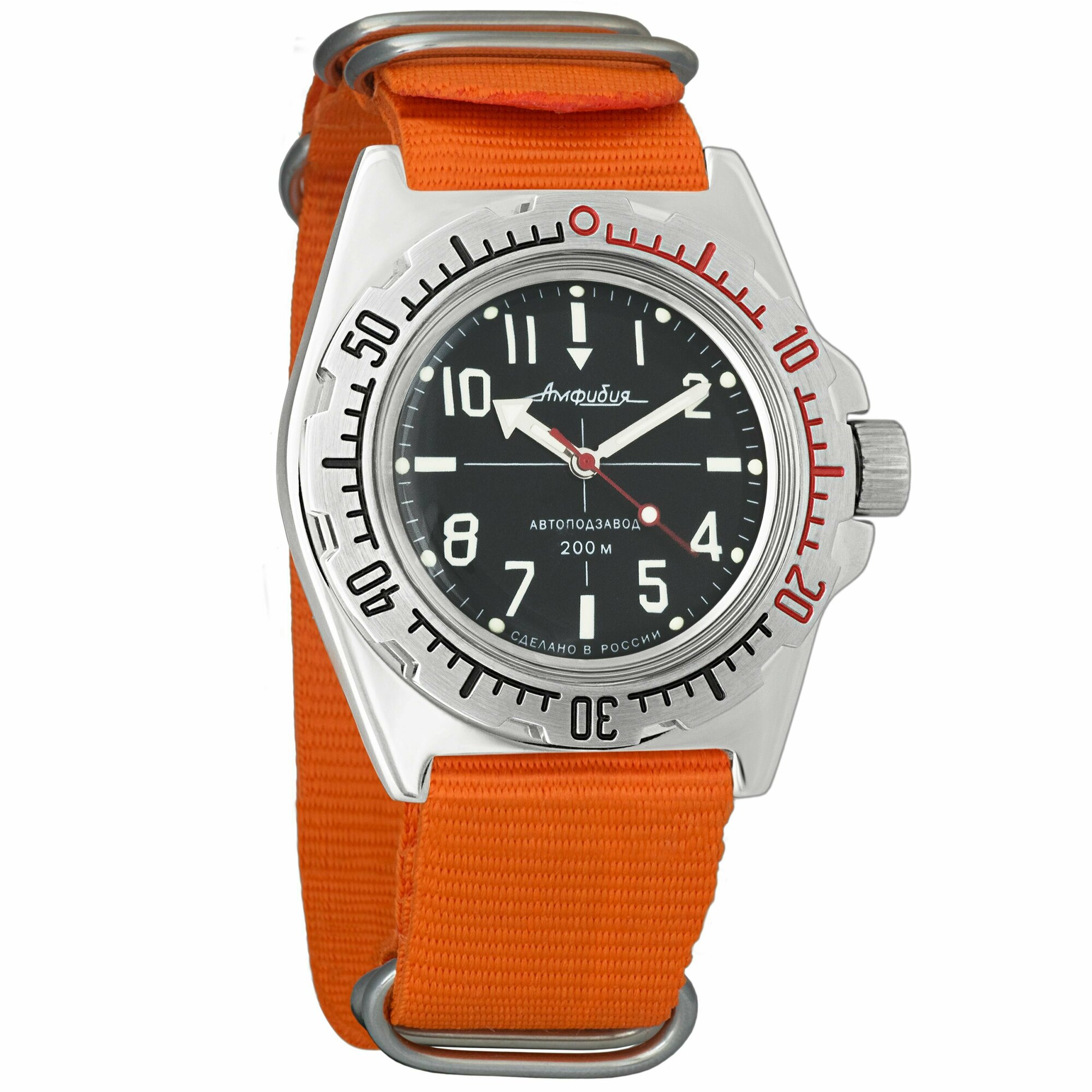 Часы наручные мужские механические с автоподзаводом Восток Амфибия 110647_black_orange, нейлон, оранжевый/черный