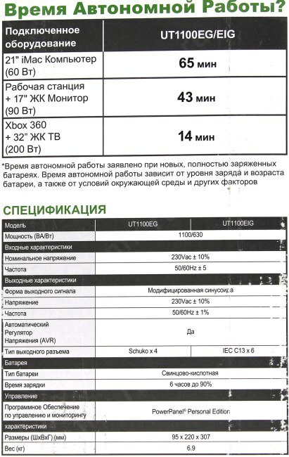 | Дополнительная информация | Время работы при нагрузке 60Вт - 65 мин, при 90Вт - 43 мин, при 200Вт - 14 мин |