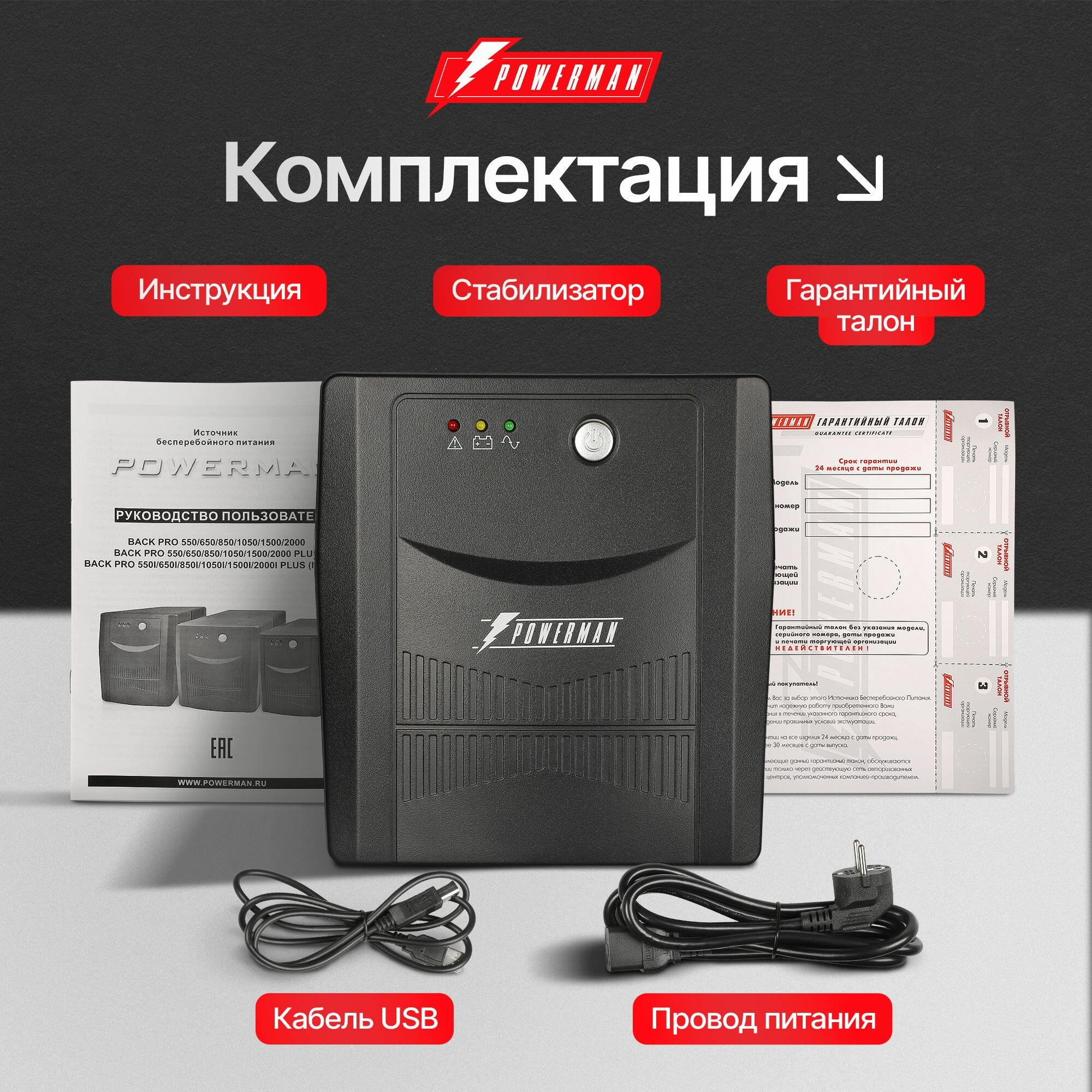 Powerman ИБП POWERMAN Back Pro 1050 PLUS, линейно-интерактивный, 1050ВА, 600Вт, 4 евророзетки с резервным питанием, USB, батарея 12В 7Ач 2 шт., 353мм х 149 мм х162мм, 10.3 кг./ UPS POWERMAN Back Pro 1050 PLUS, line-interactive, 1050VA, 600W, 4 euro socket
