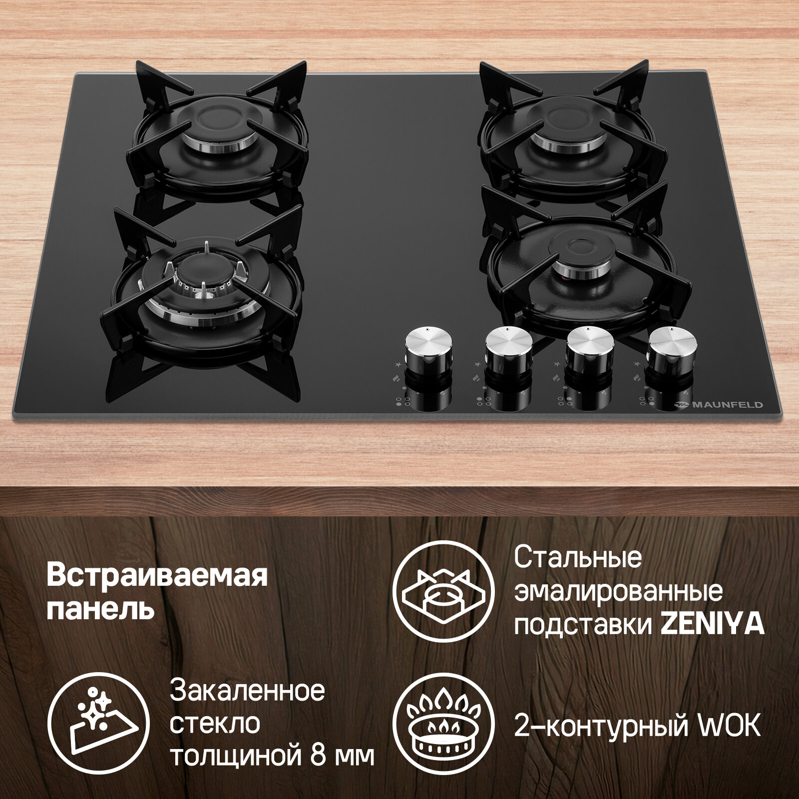 Газовая варочная панель MAUNFELD EGHG.64.13STS-EB, 60 см ширина, WOK-конфорка, SABAF горелки, закаленное стекло, электроподжиг, газ-контроль интересное: