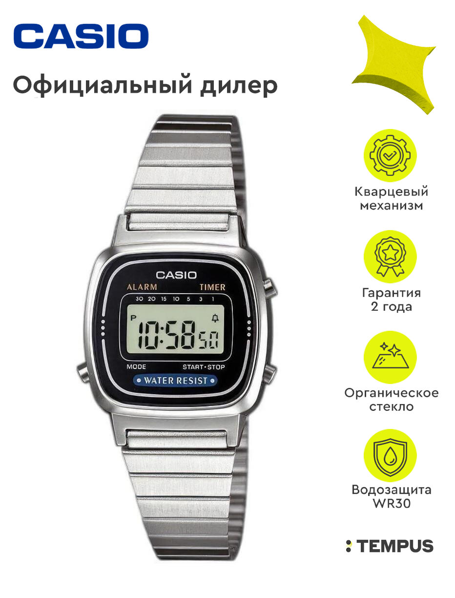 LA670WA-2D Casio наручные часы кварцевые WR30 (3 атм) женские серебряный секундомер, таймер обратного отсчета будильник отображение дня недели, отображение месяца, отображение числа акриловое стекло