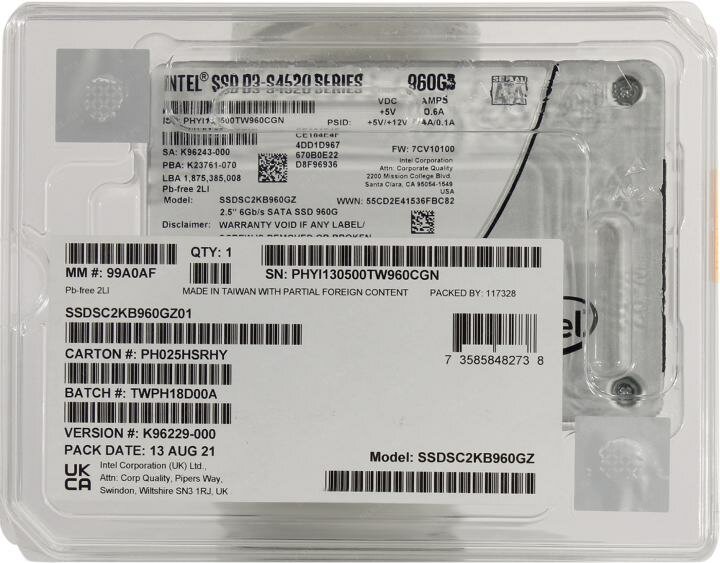 Накопитель SSD 960Gb Intel D3-S4520 (SSDSC2KB960GZ01)