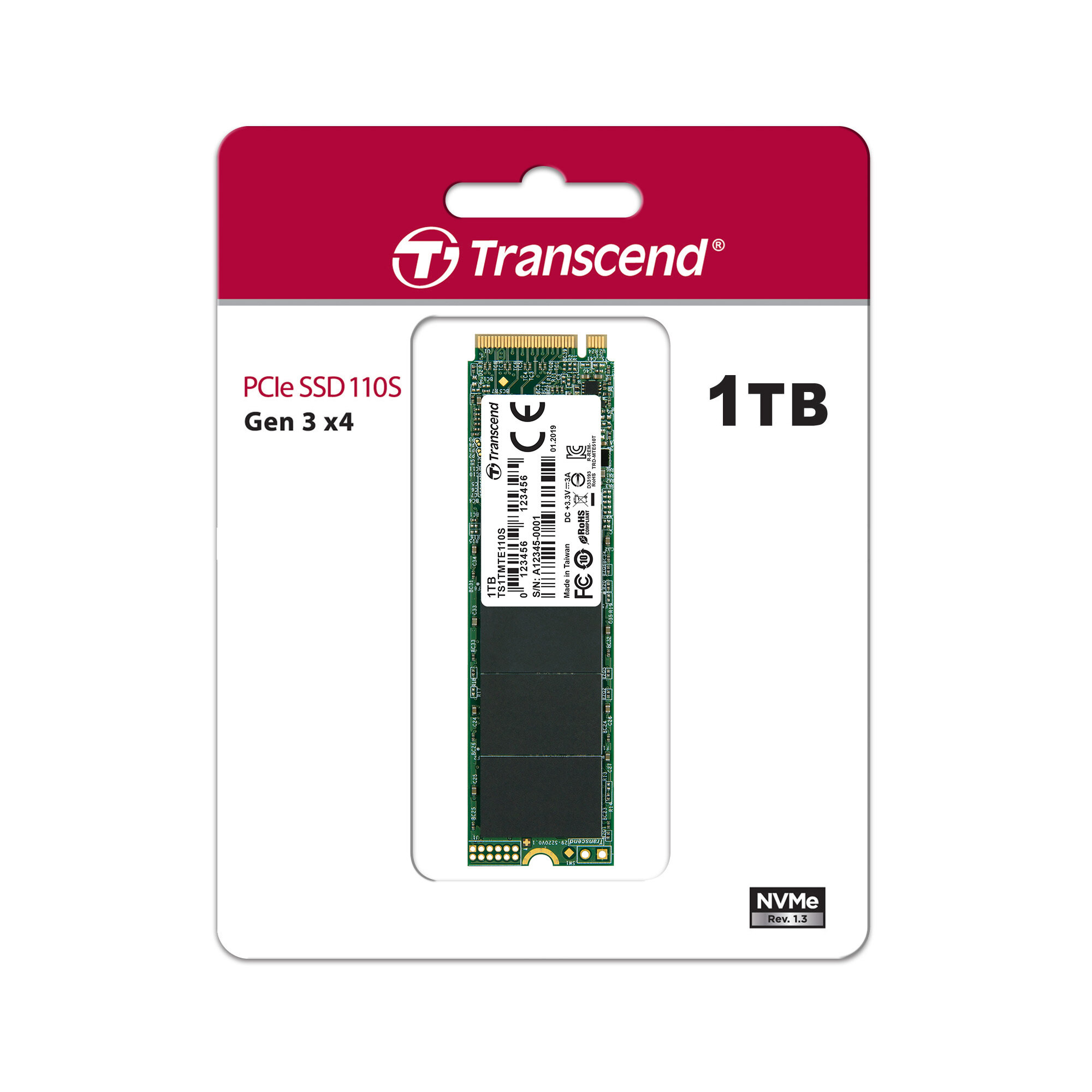 SSD M.2 Transcend 1.0Tb MTE110S TS1TMTE110S (PCI-E 3.0 x4, up to 1800/1500Mbs, 180000 IOPs, 3D TLC, SM2263T, NVMe 1.3, 22х80mm)