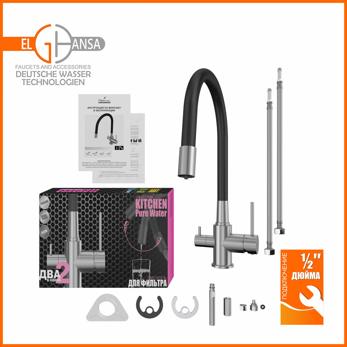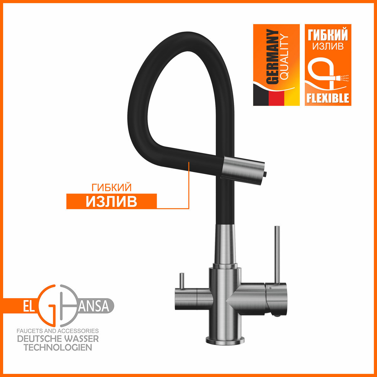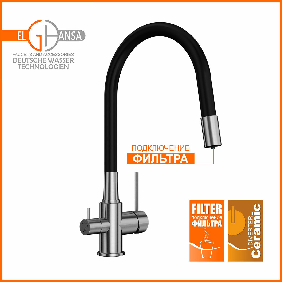 Смеситель для кухни с гибким изливом для подключения фильтра питьевой воды Elghansa 56F5216-Steel из нержавеющей стали