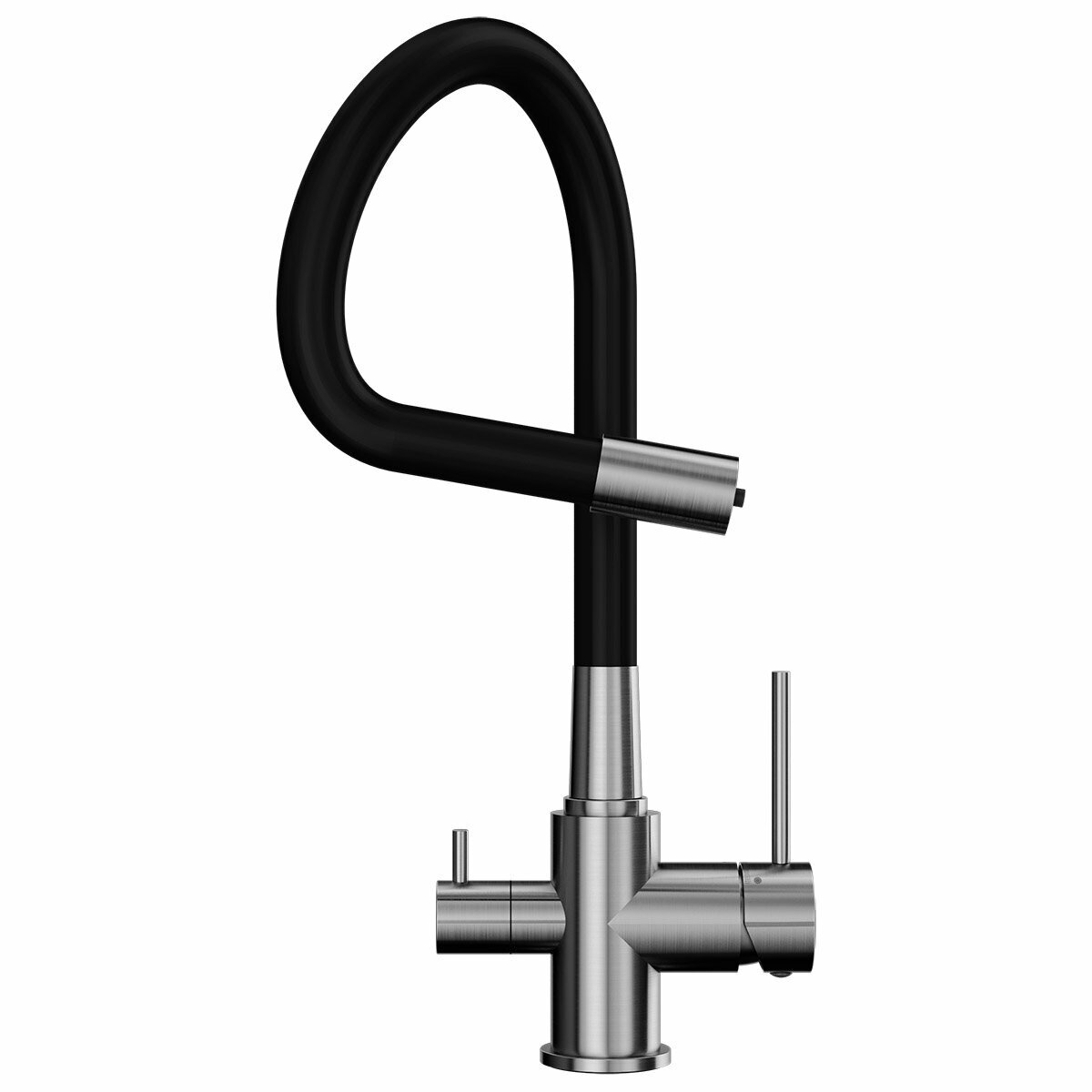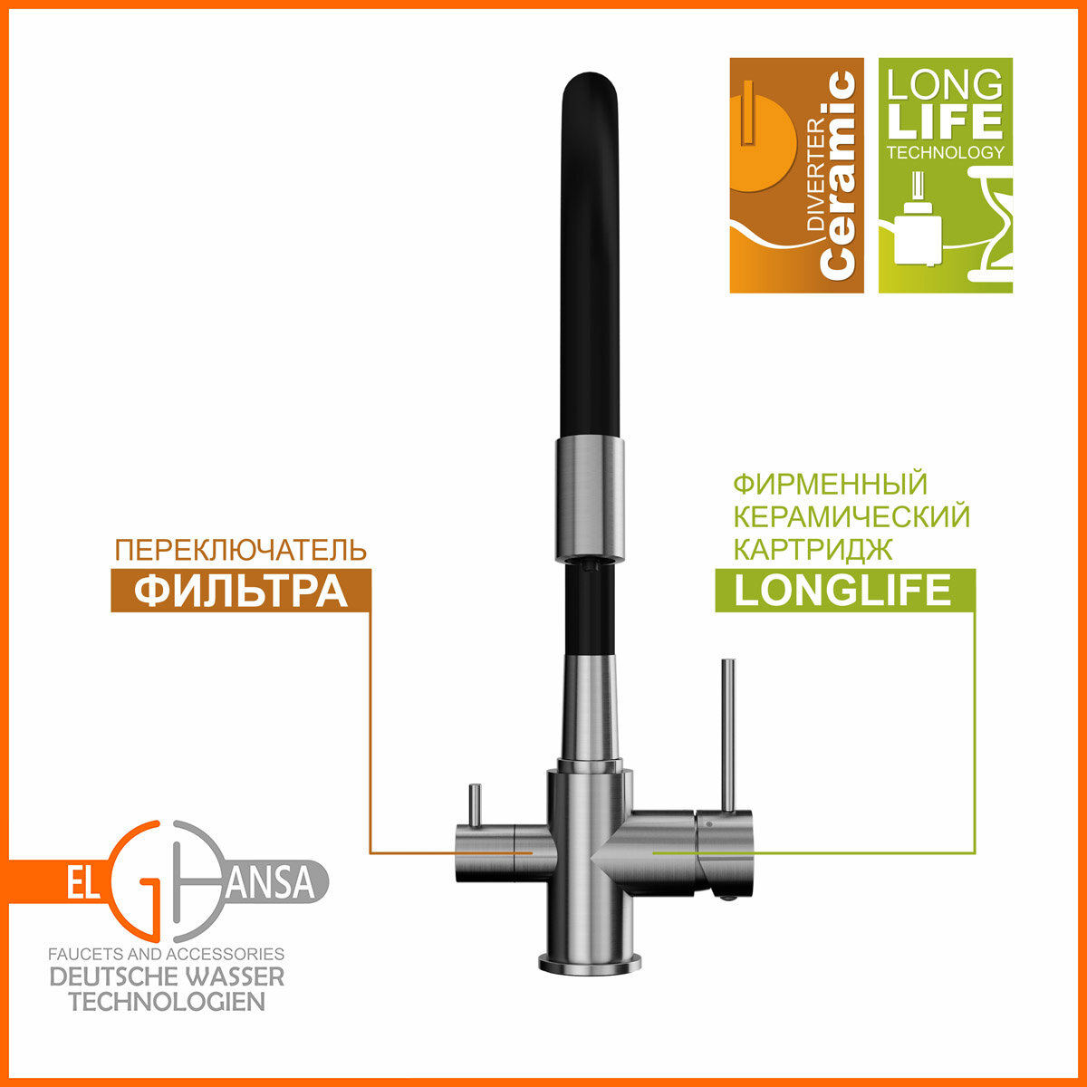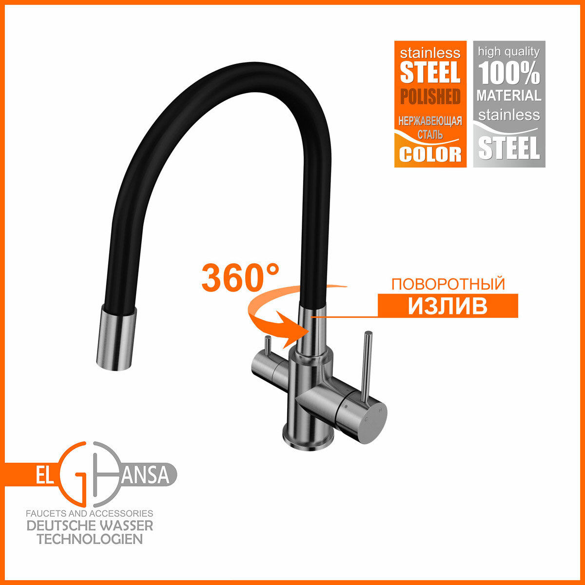 Смеситель для кухни с гибким изливом для подключения фильтра питьевой воды Elghansa 56F5216-Steel из нержавеющей стали