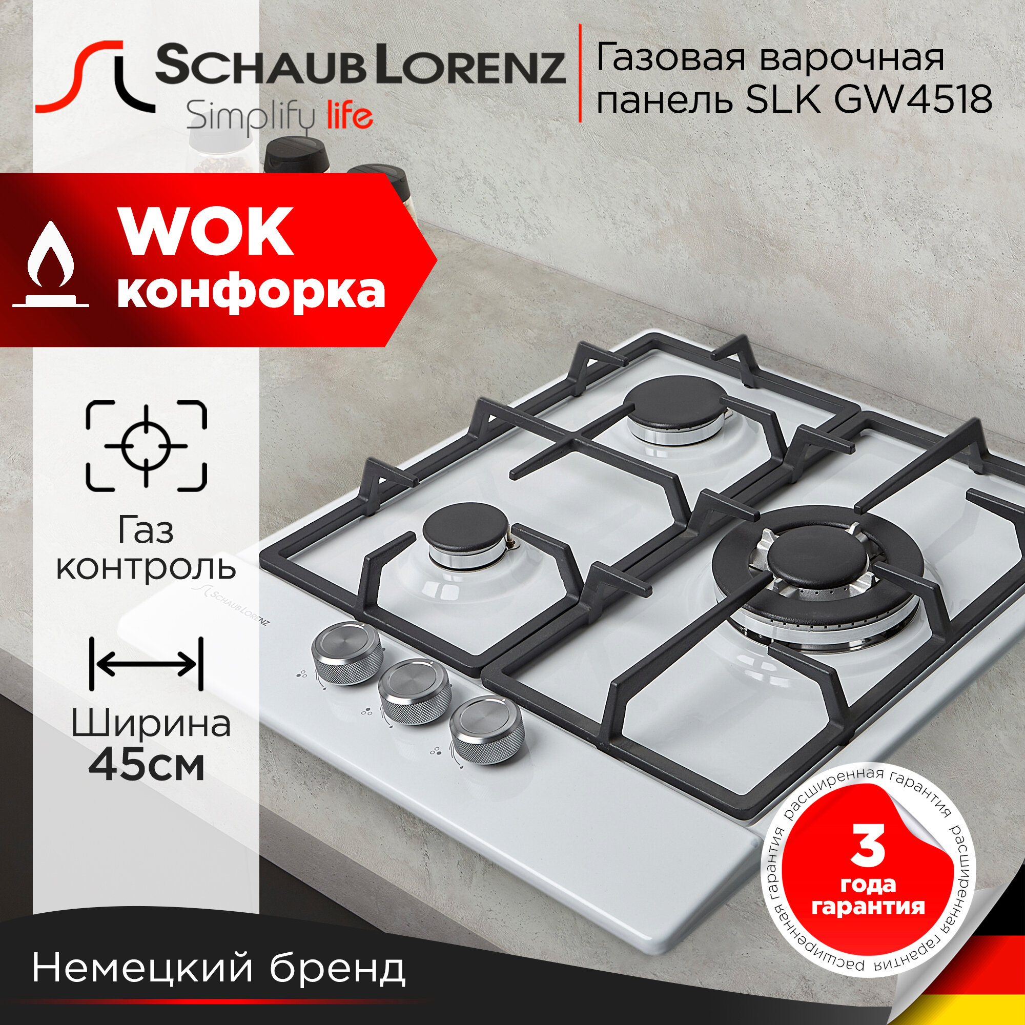 Встраиваемая газовая варочная поверхность Schaub Lorenz SLK GW4518, 45см, белый, автоподжиг, WOK