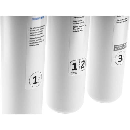| Дополнительная информация | картриджи в наборе: 1) механика смарт – вспененный полипропиленовый картридж для механической очистки питьевой воды от нерастворимых примесей; 2) умягчитель смарт – ионообменная смола пищевого класса. удаляет соли жесткости; 3) посткарбон ag смарт – содержит высококачественный кокосовый уголь и материал каталон. удаляет хлор, органические и хлорорганические |