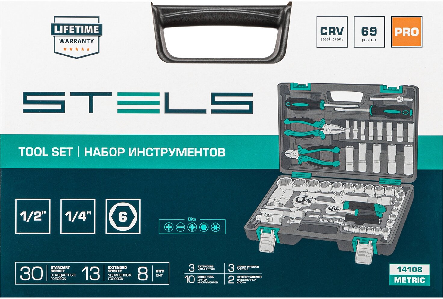 stels набор инструментов, 1/2 , 1/4 , crv, пластиковый кейс 69 предметов 14108