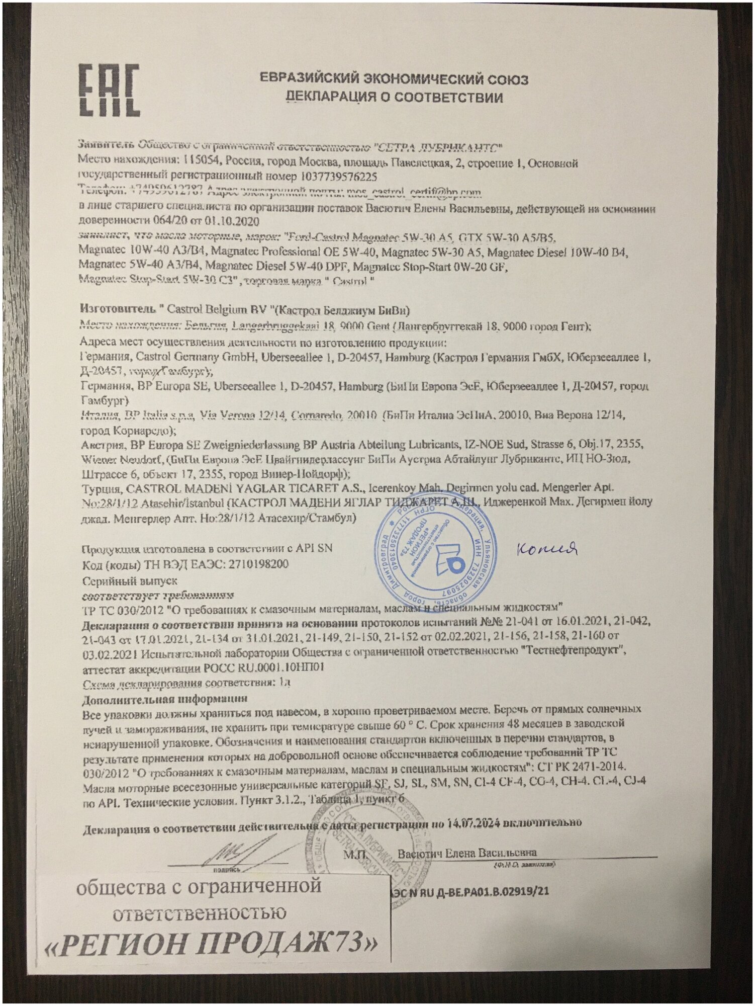| Плюсы: | Применяется в двигателе ваз 21214i. Замена через 7000 км. без долива в этот интервал пробега. Приобретается через сеть магазинов Ашан, Авторусь, БИ-БИ. Двигатель под клапанной крышкой без отложений. Применяю масла Castrol с 2010 года, в том числе в КПП и трансмиссии. Зимой запуск с первого раза. |