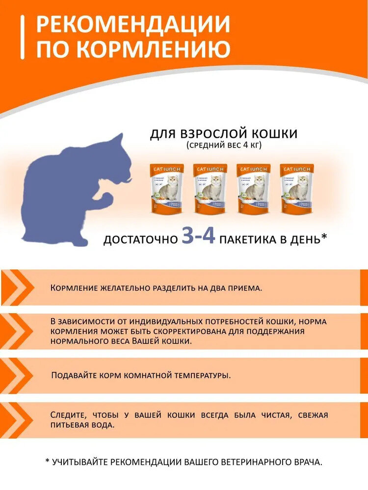 | Дозировка | для взрослой кошки среднего веса (4 кг) необходимо 3-4 пакетика в день. Переход с предыдущего рациона следует осуществлять постепенно, небольшими порциями в течение 5-7 дней. При кормлении необходимо учитывать активность и аппетит животного. У кошки всегда должен быть доступ к свежей питьевой воде |