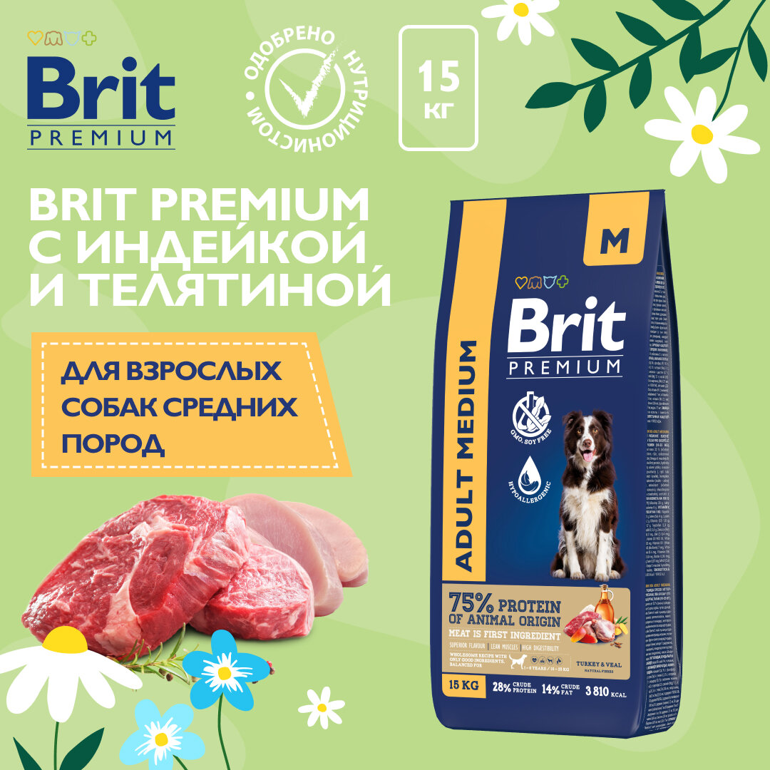 Купить Корм сухой Brit Premium Dog Adult Medium для взрослых собак средних пород 10–25 кг, с индейкой и телятиной 15 кг