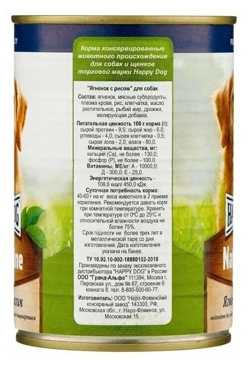 Упаковка банок HAPPY DOG для собак Ягненок с рисом нфкз (400гр x 20шт)