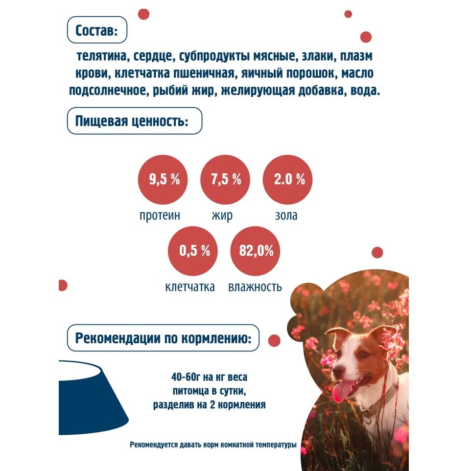 | Состав | телятина, сердце, субпродукты мясные, злаки, плазма крови, клетчатка пшеничная, яичный порошок, масло подсолнечное, рыбий жир, желирующая добавка, вода |