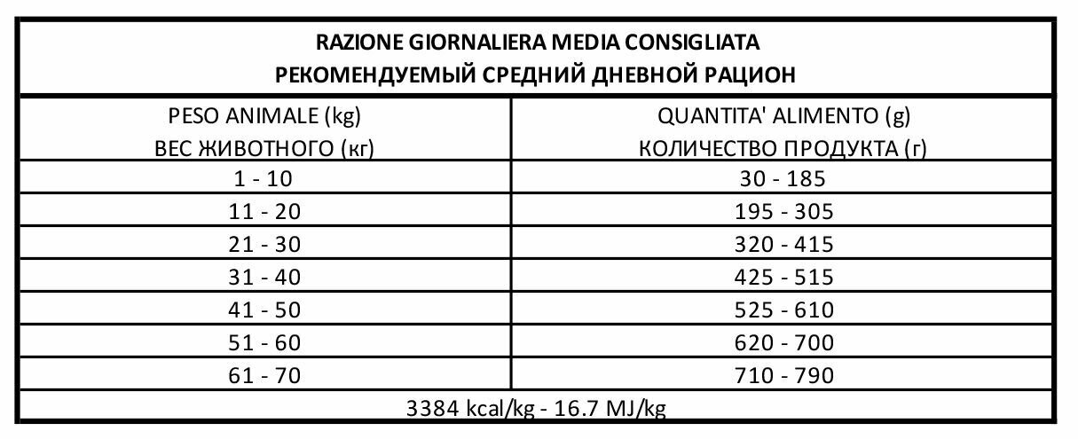 | Состав | обработанные белки животных (ягнёнок, оленина 6.1%), маис, сорго белое, рис, картофель 4.1%, рыбий жир, пульпа свеклы, кукурузное масло, минеральные вещества, дегидратированные дрожжи (Био МОС), ФОС, Юкка Шидигера. Добавки: витамин А — 18000 МЕ/кг, витамин D3 — 1500 МЕ/кг, витамин Е — 240 мг/кг, хлорид холина — 1000 мг/кг, моногидратный сульфат цинка — 137 мг/кг, хелатное соединение меди — 39 мг/кг, DL-метионин — 500 мг/кг. |