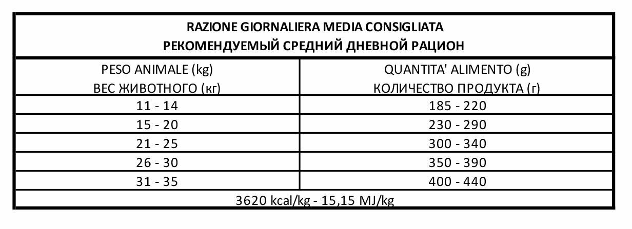 | Состав | обработанные белки животных (ягнёнок, оленина 6.1%), маис, сорго белое, рис, картофель 4.1%, рыбий жир, пульпа свеклы, кукурузное масло, минеральные вещества, дегидратированные дрожжи (Био МОС), ФОС, Юкка Шидигера. Добавки: витамин А — 18000 МЕ/кг, витамин D3 — 1500 МЕ/кг, витамин Е — 240 мг/кг, хлорид холина — 1000 мг/кг, моногидратный сульфат цинка — 137 мг/кг, хелатное соединение меди — 39 мг/кг, DL-метионин — 500 мг/кг. |